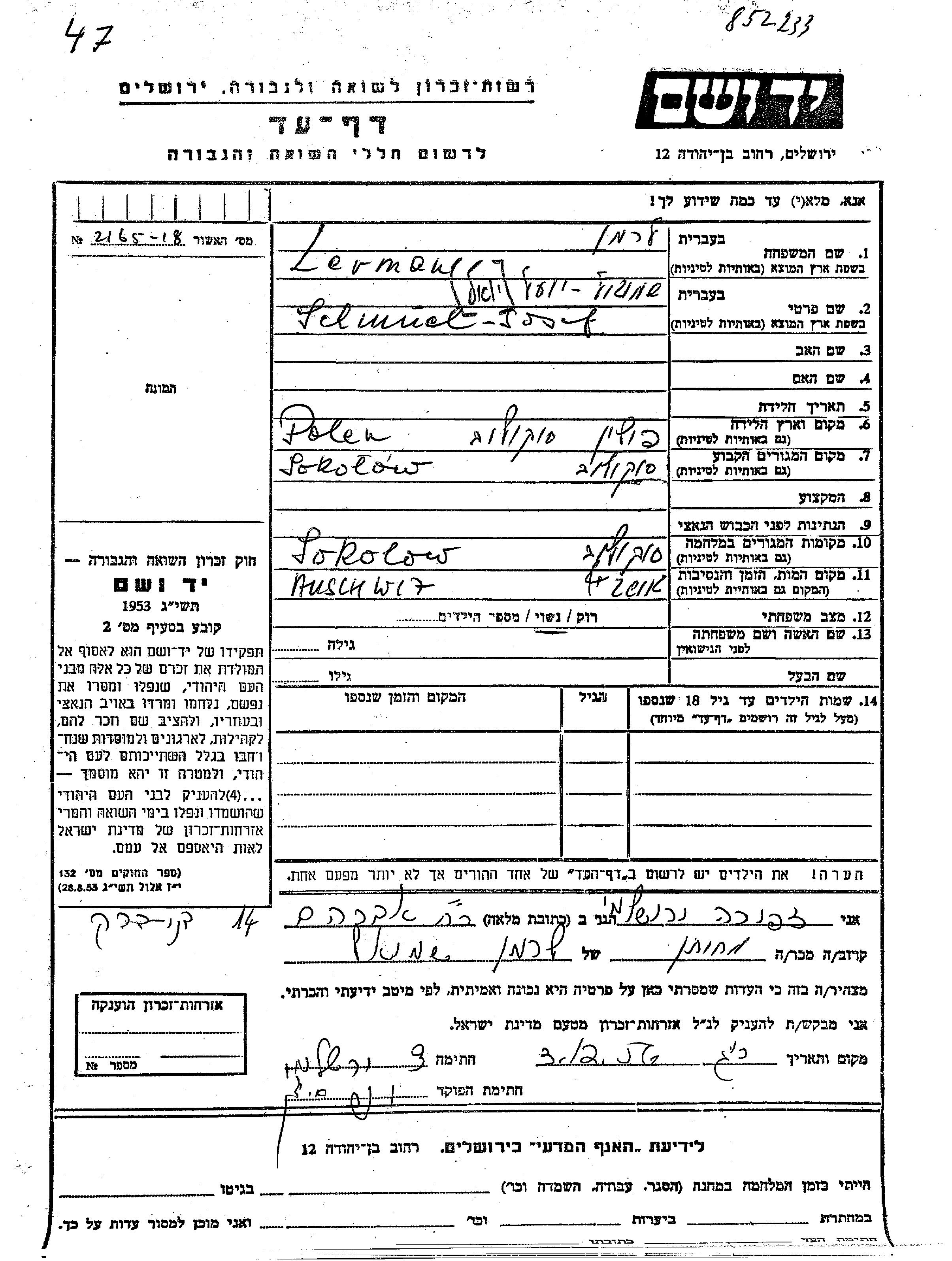 Шмуэль Йосеф Йоэль Лерман, место рождения: Соколув-Подляски, Польша. Женат / замужем. Место жительства до войны: Соколув-Подляски, Польша. Место во время войны: Соколув-Подляски, Польша.