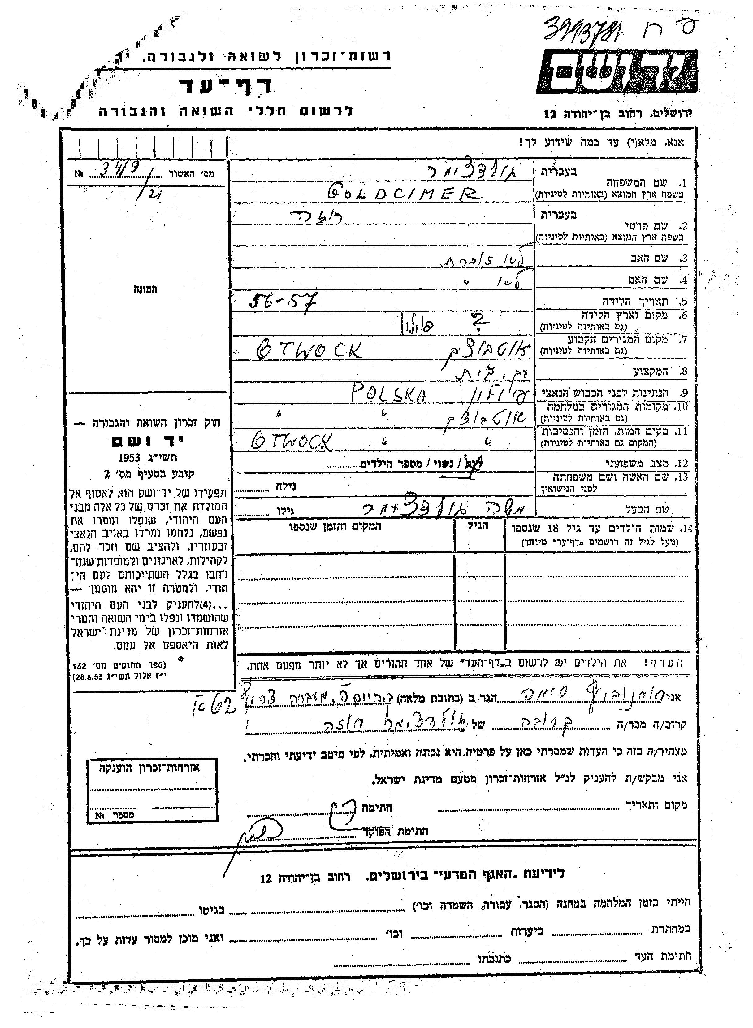 Гольдцимер Роза Отвоцк, Польша Лист свидетельских показаний