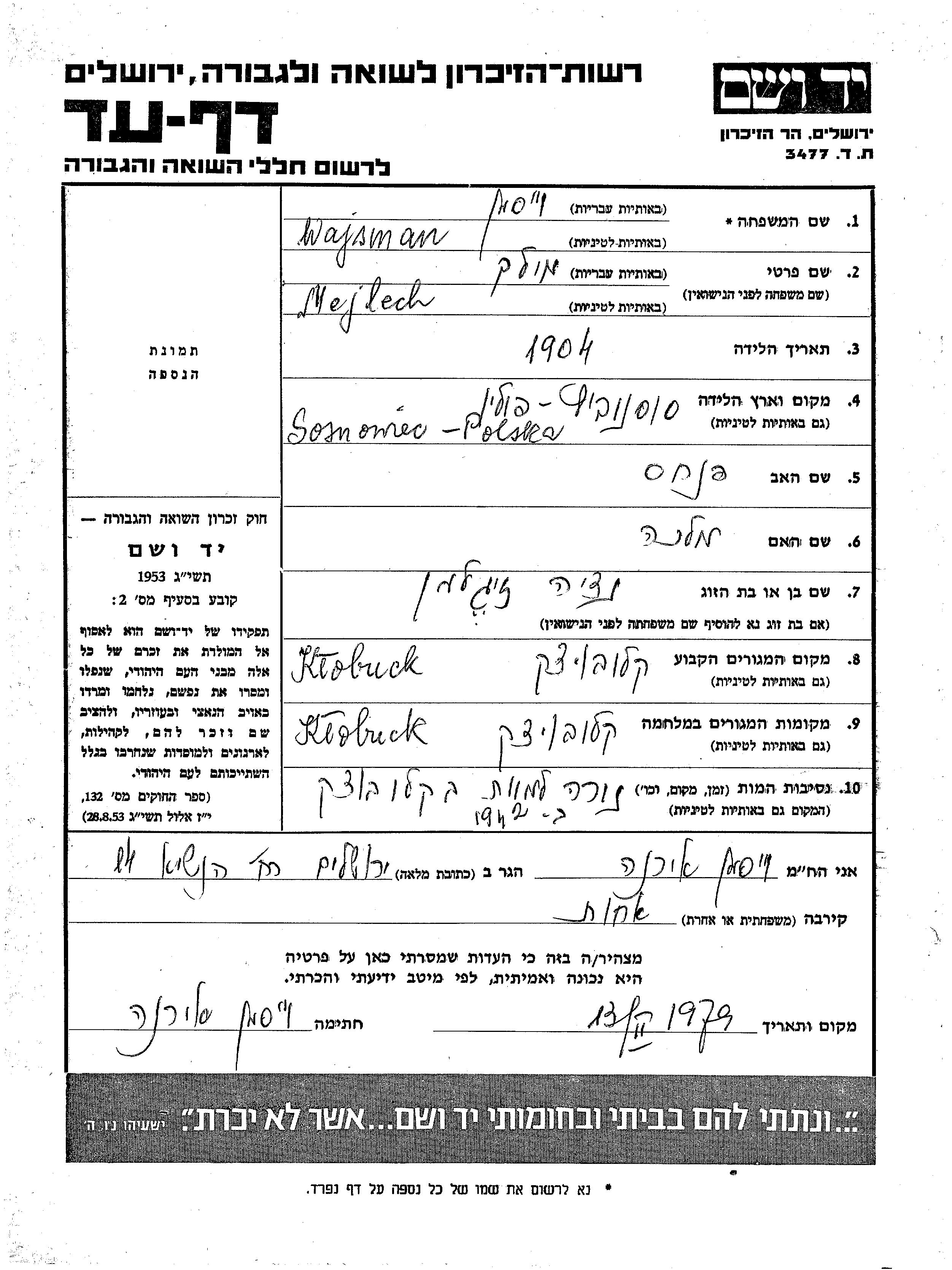 Мейлех Вайсман, место рождения: Сосновец, Польша. Отец: Пинхас, mать:Малка. Женат / замужем. Место жительства до войны: Клобуцк, Польша. Место во время войны: Клобуцк, Польша.