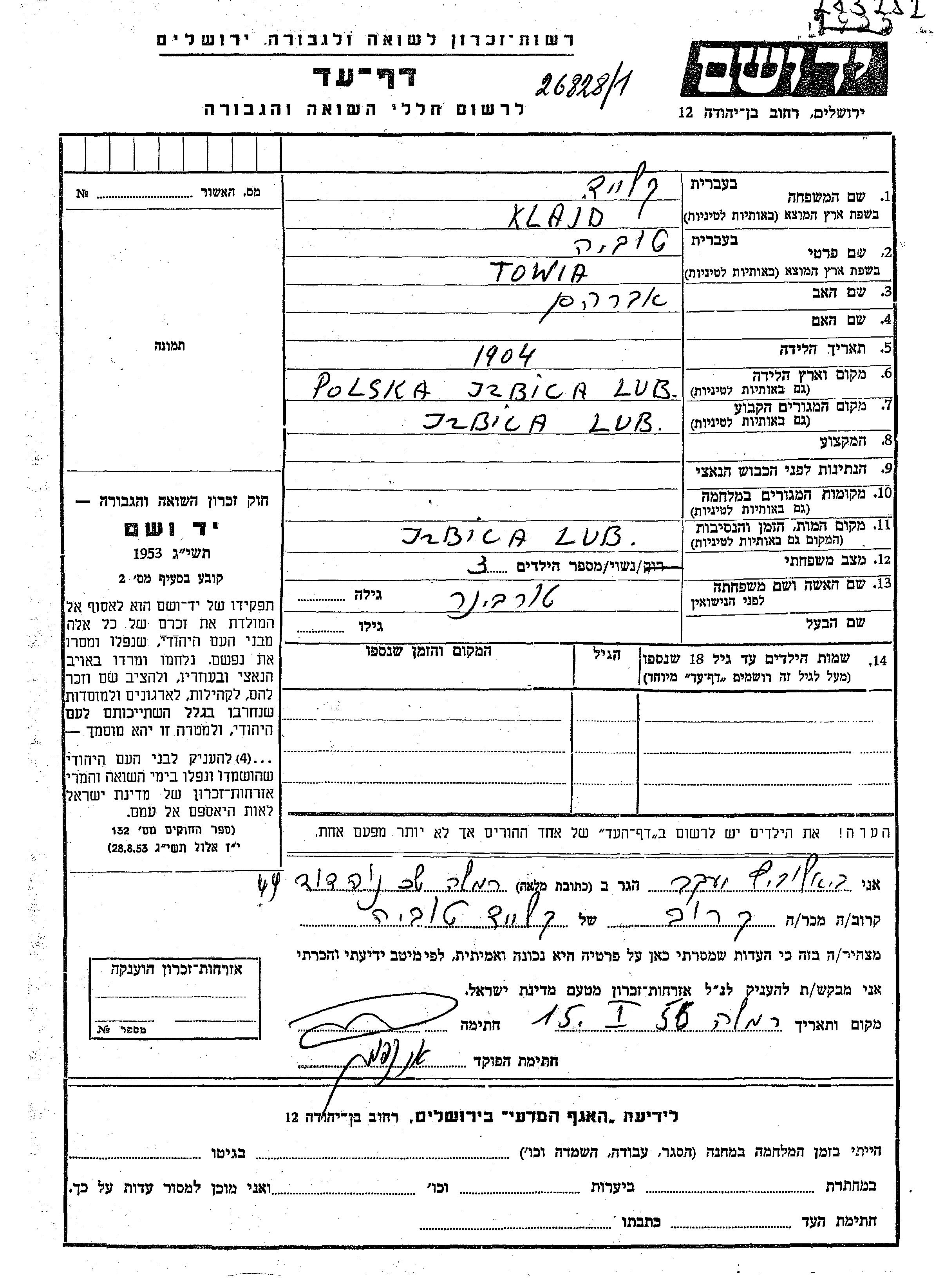 Товия Клайд, место рождения: Избица-Любельска, Польша. Отец: Авраам. Женат / замужем. Место жительства до войны: Избица-Любельска, Польша.
