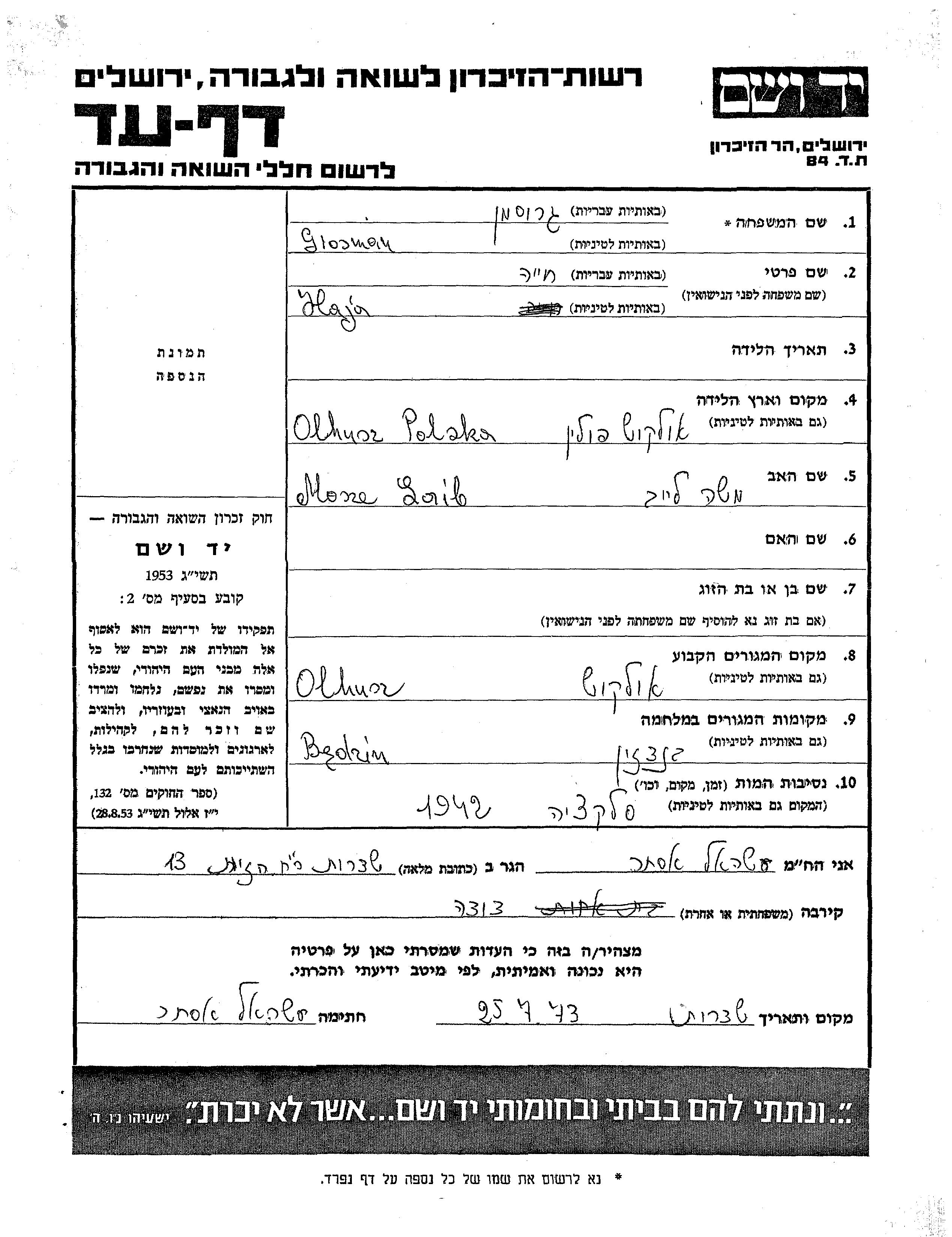 Хая Гросман, место рождения: Олькуш, Польша. Отец: Моше Лайб. Место жительства до войны: Олькуш, Польша. Место во время войны: Бендзин, Польша.