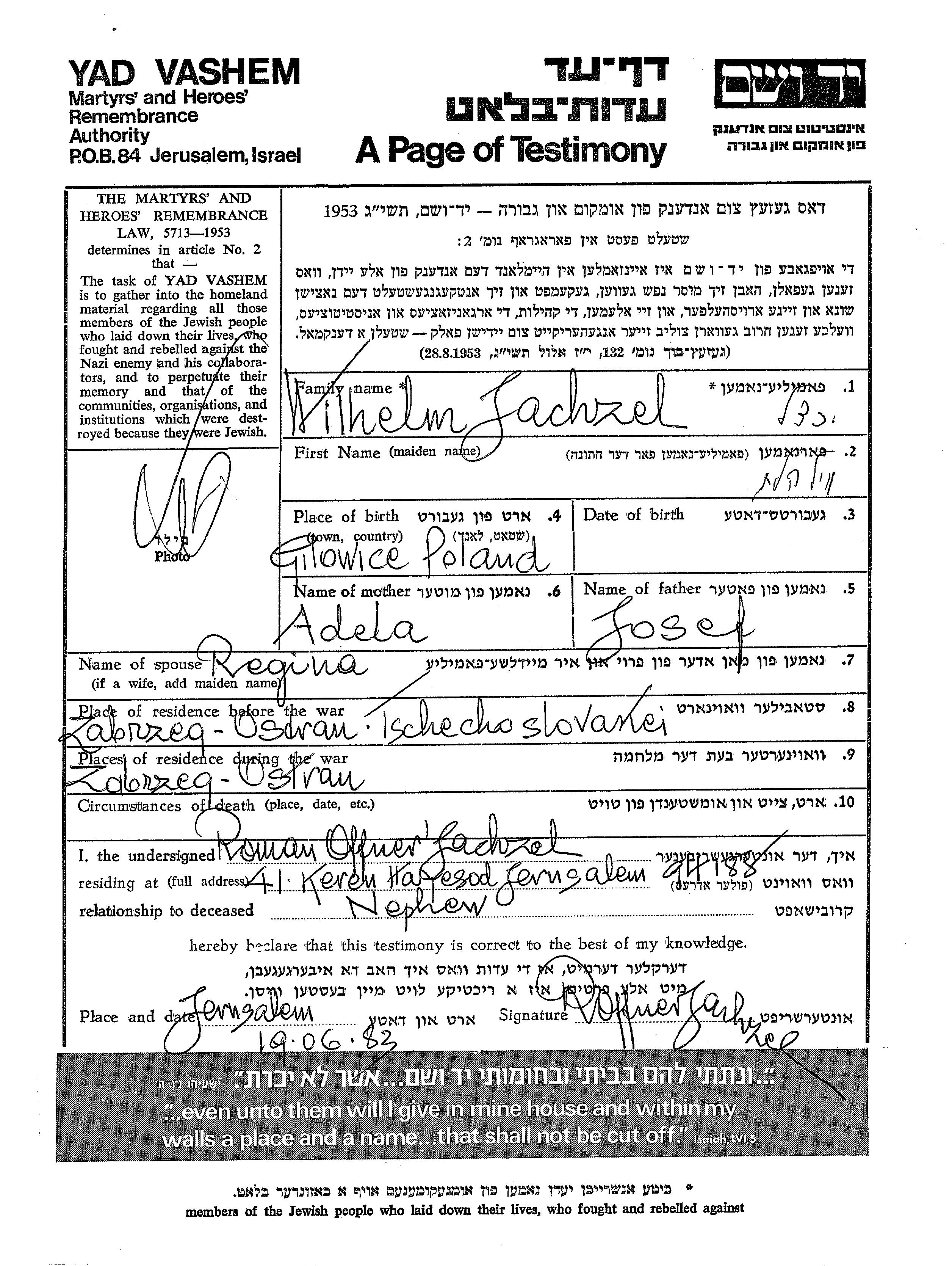 Вильхельм Яхцель, место рождения: Гиловице, Польша. Отец: Йосеф, mать:Адела. Женат / замужем. Место жительства до войны: Забржег, Чехословакия. Место во время войны: Острава, Чехословакия.