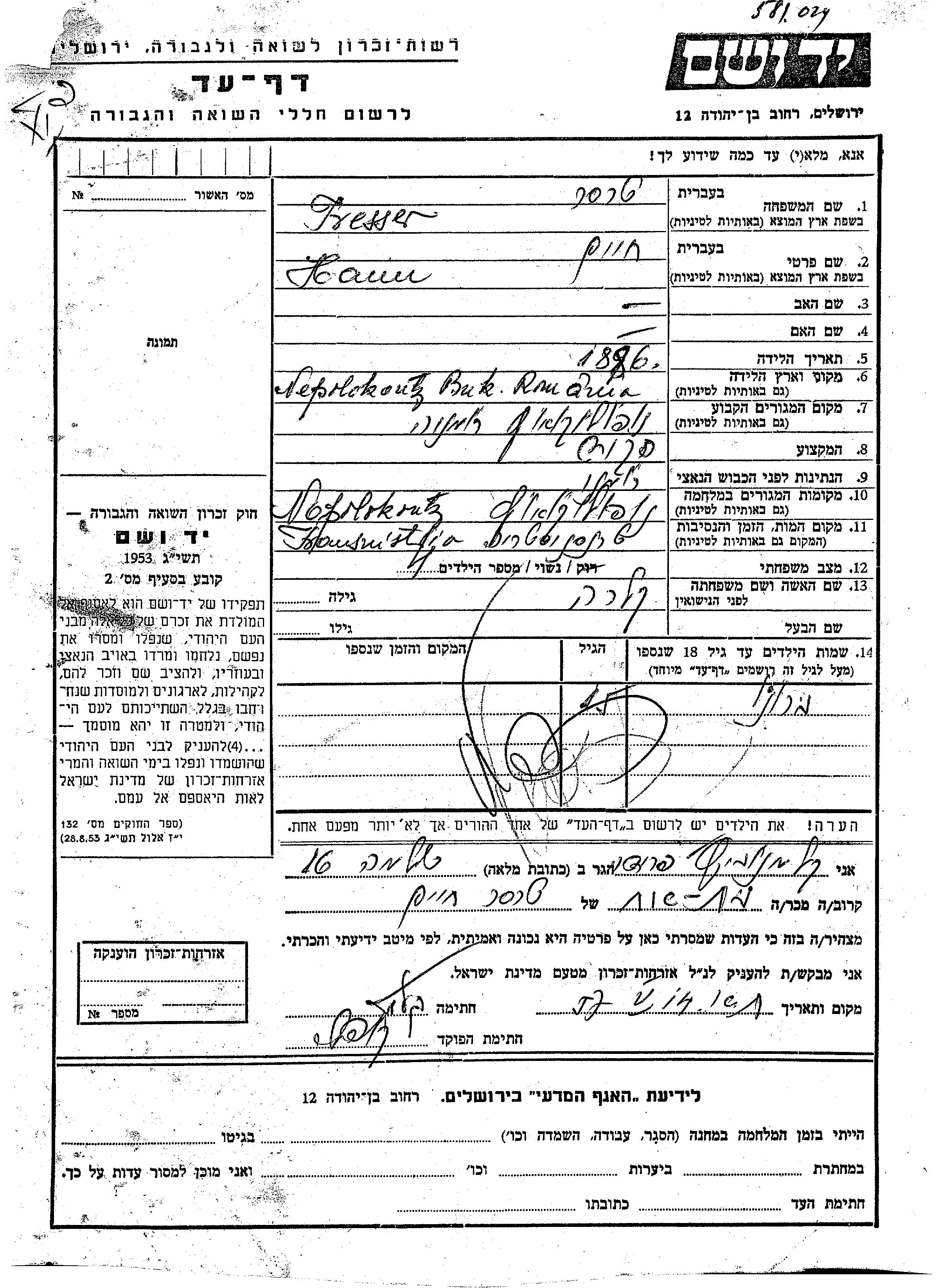 Хаим Трессер, место рождения: Неполкоуц, Румыния. Клерк. Женат / замужем. Место жительства до войны: Неполкоуц, Румыния. Место во время войны: Неполкоуц, Румыния.