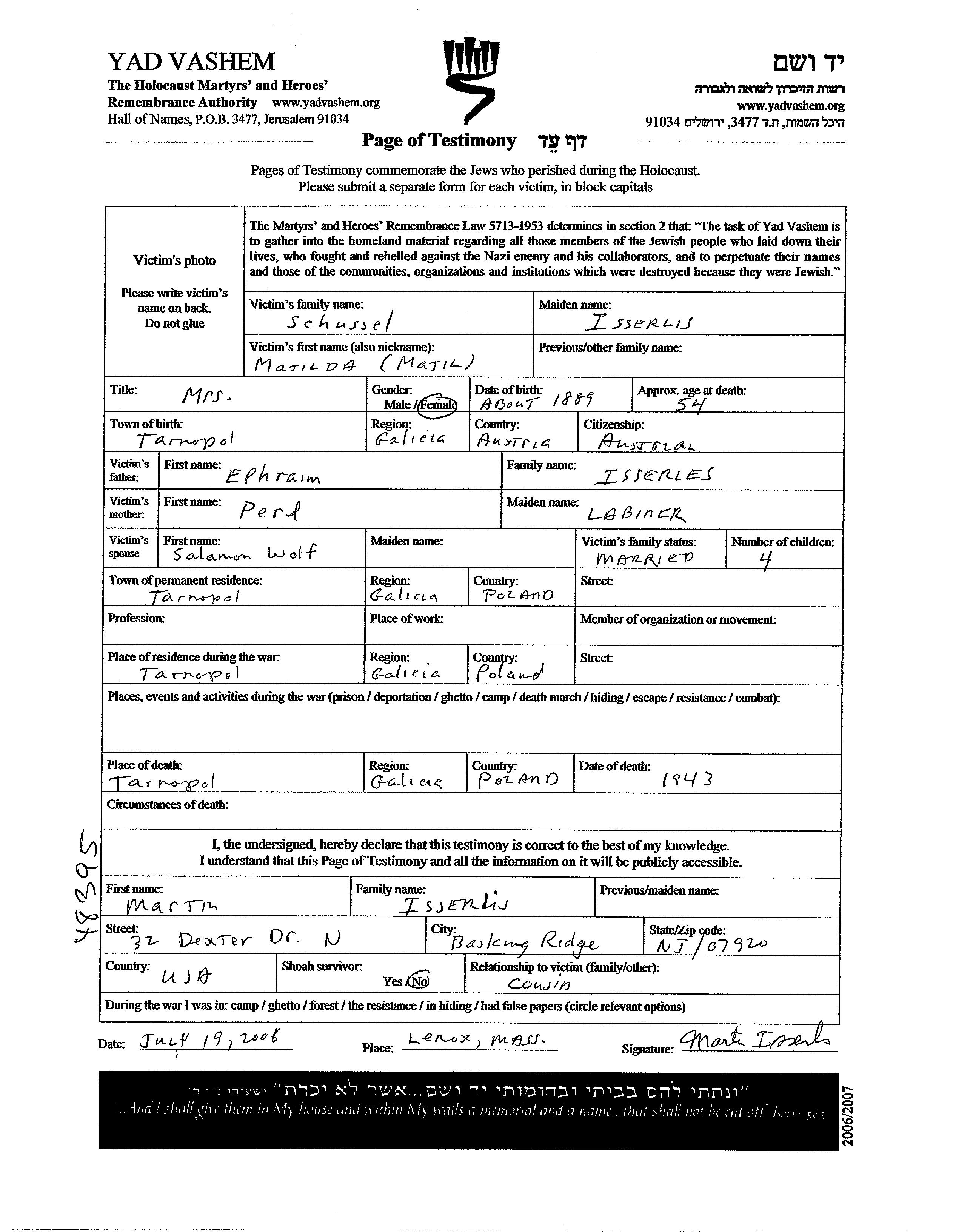 Матиль Шуссель, девичья фамилия Иссерлис, место рождения: Тарнополь, Польша. Отец: Эфраим, mать:Перл, девичья фамилия Лабинер. Женат / замужем. Место жительства до войны: Тарнополь, Польша. Место во время войны: Тарнополь, Польша.