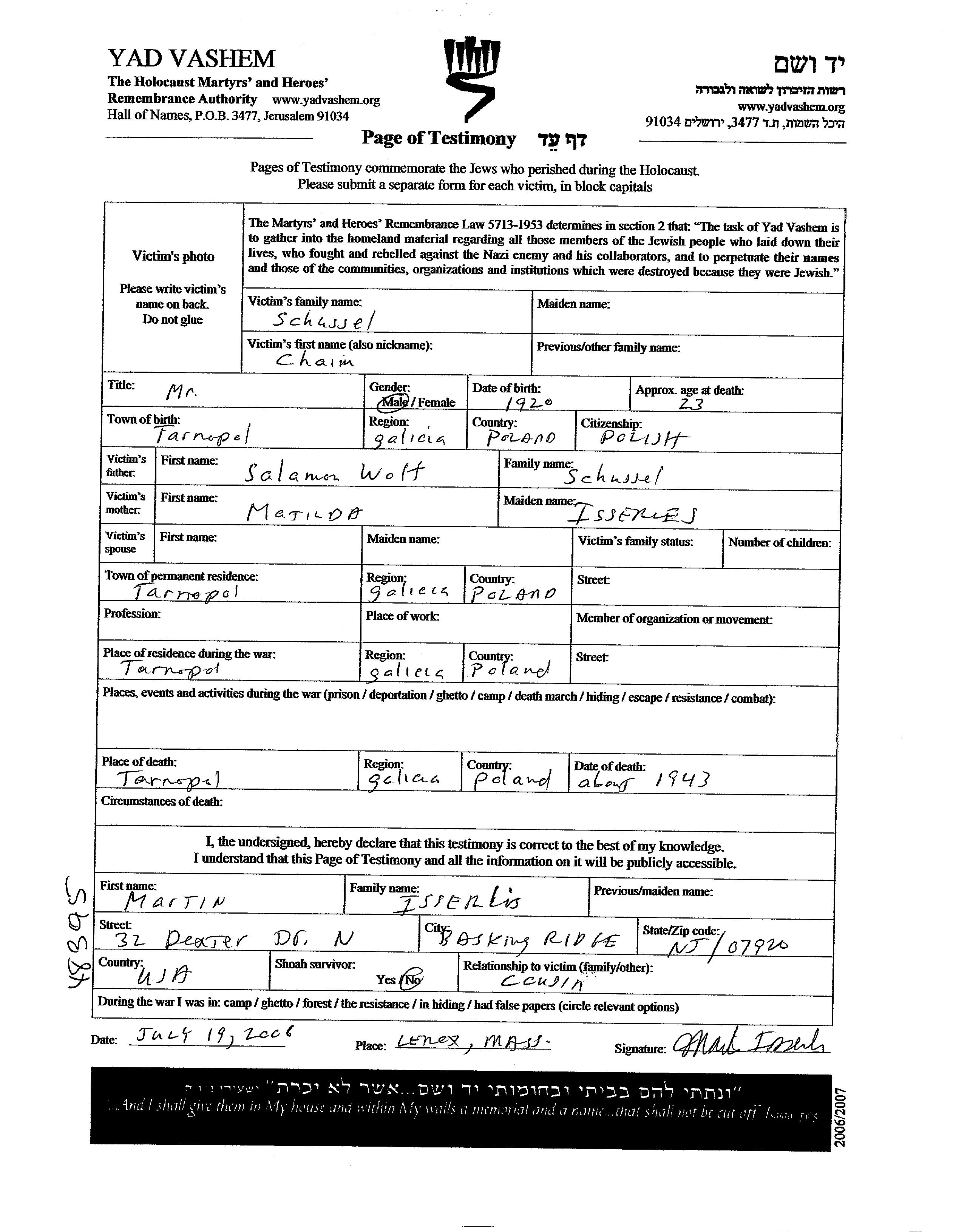 Хаим Шуссель, место рождения: Тарнополь, Польша. Отец: Вольф Саламон, mать:Матильда, девичья фамилия Иссерлес. Место жительства до войны: Тарнополь, Польша. Место во время войны: Тарнополь, Польша.