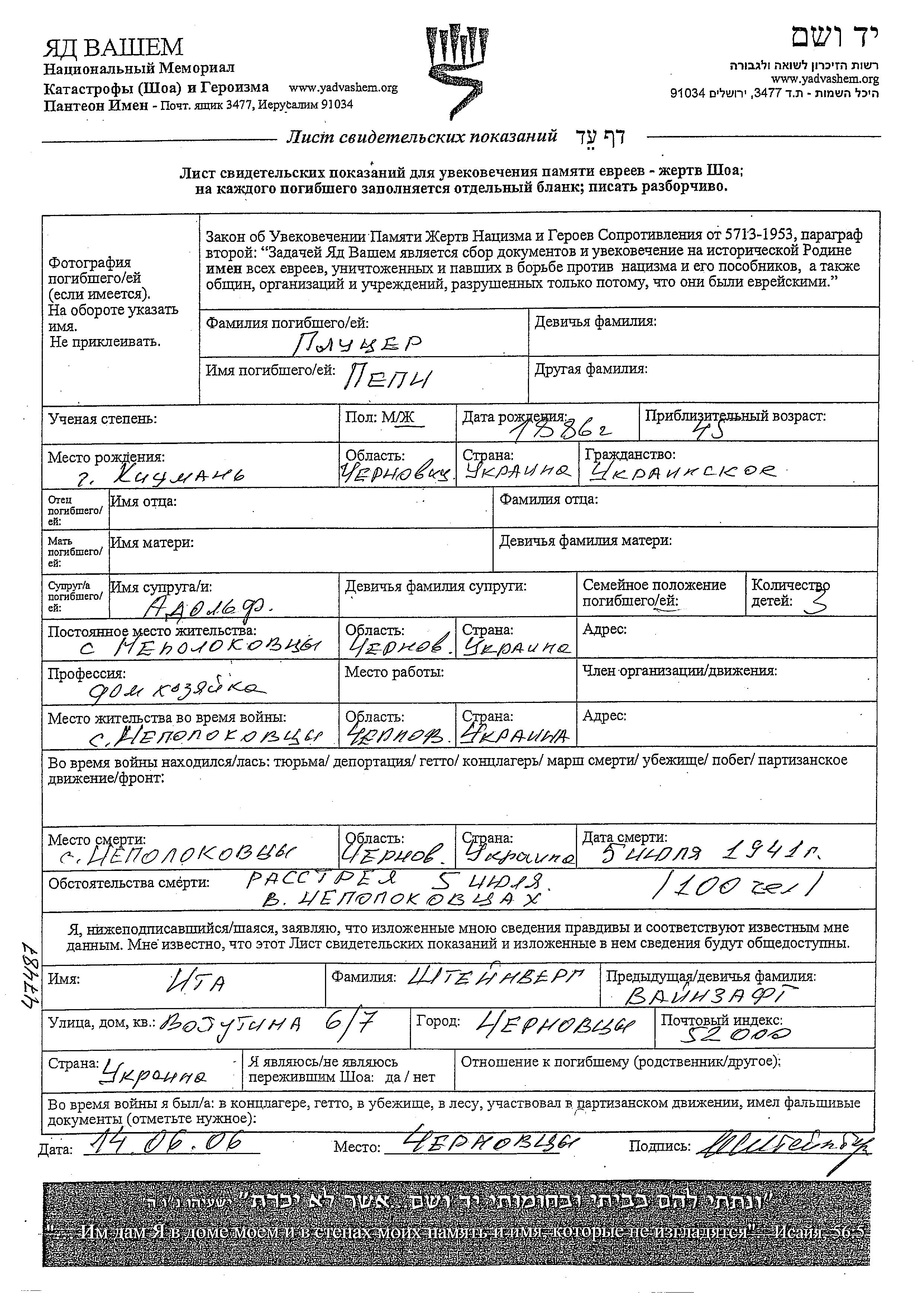 Пепи Плуцер, место рождения: Кицмань, Румыния. Домохозяйка. Женат / замужем. Место жительства до войны: Неполоковцы, Румыния. Место во время войны: Неполоковцы, Румыния.