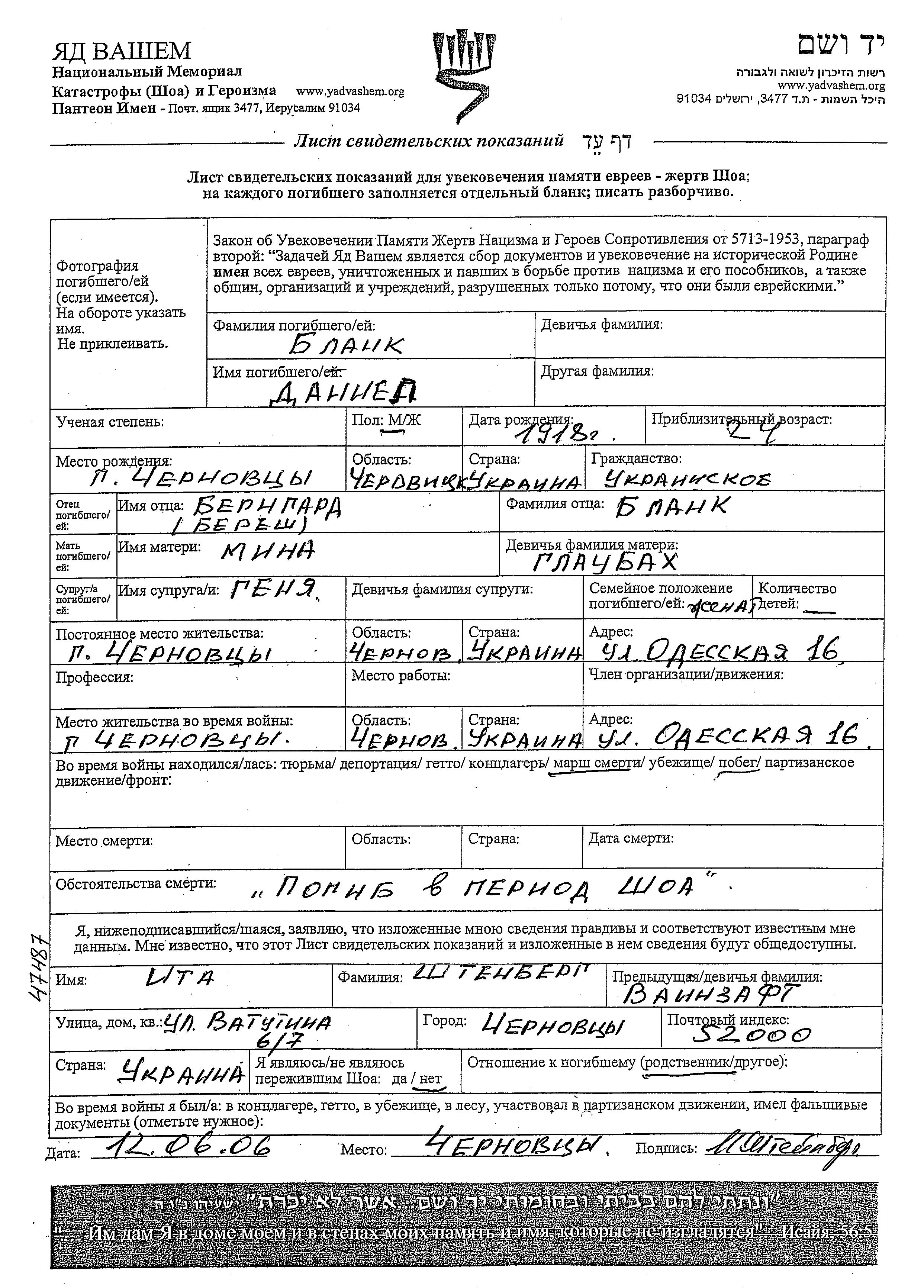Бланк Даниэль 1918 Черновцы, Румыния Лист свидетельских показаний