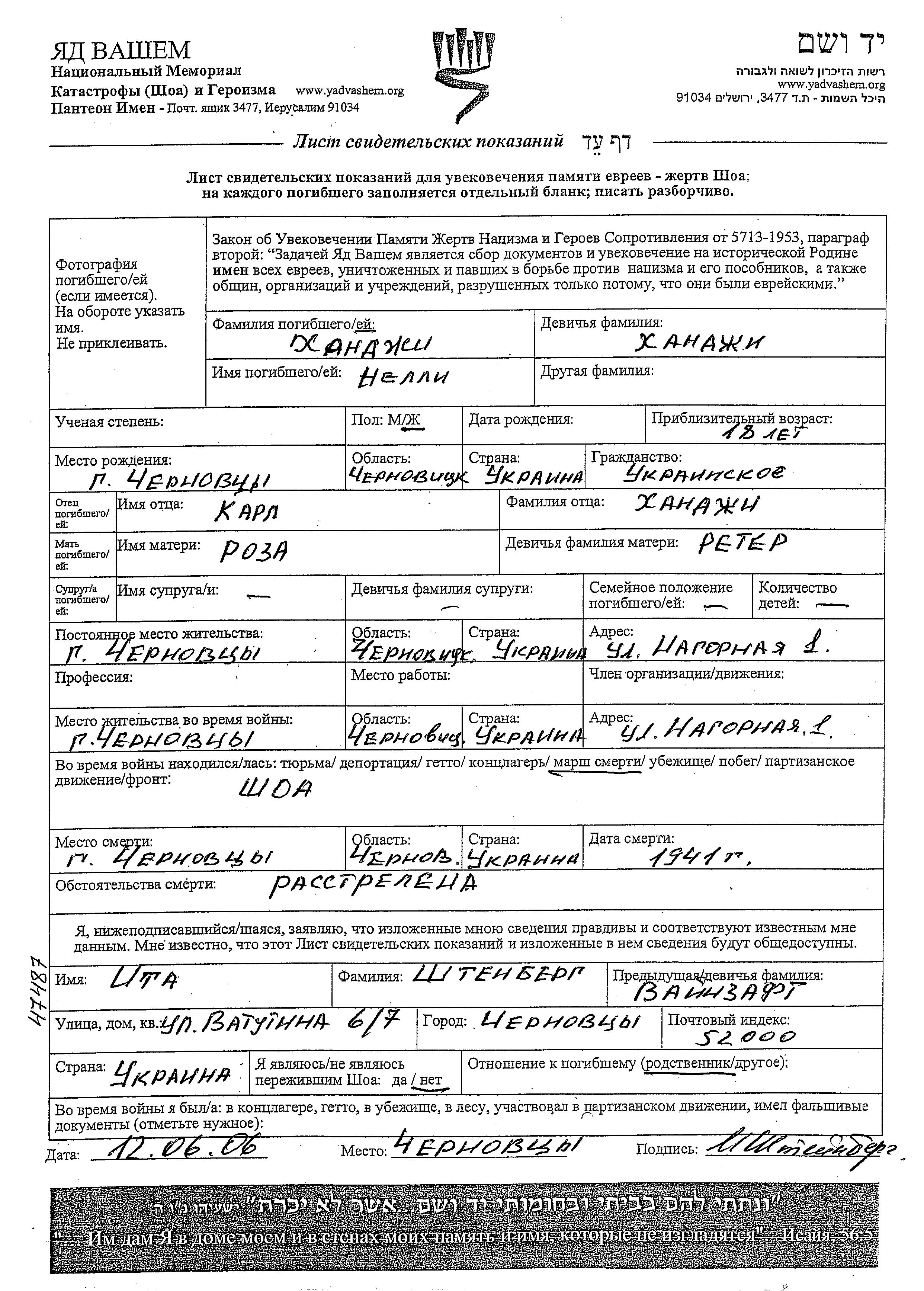 Ханджи Нелли Черновцы, Румыния Лист свидетельских показаний