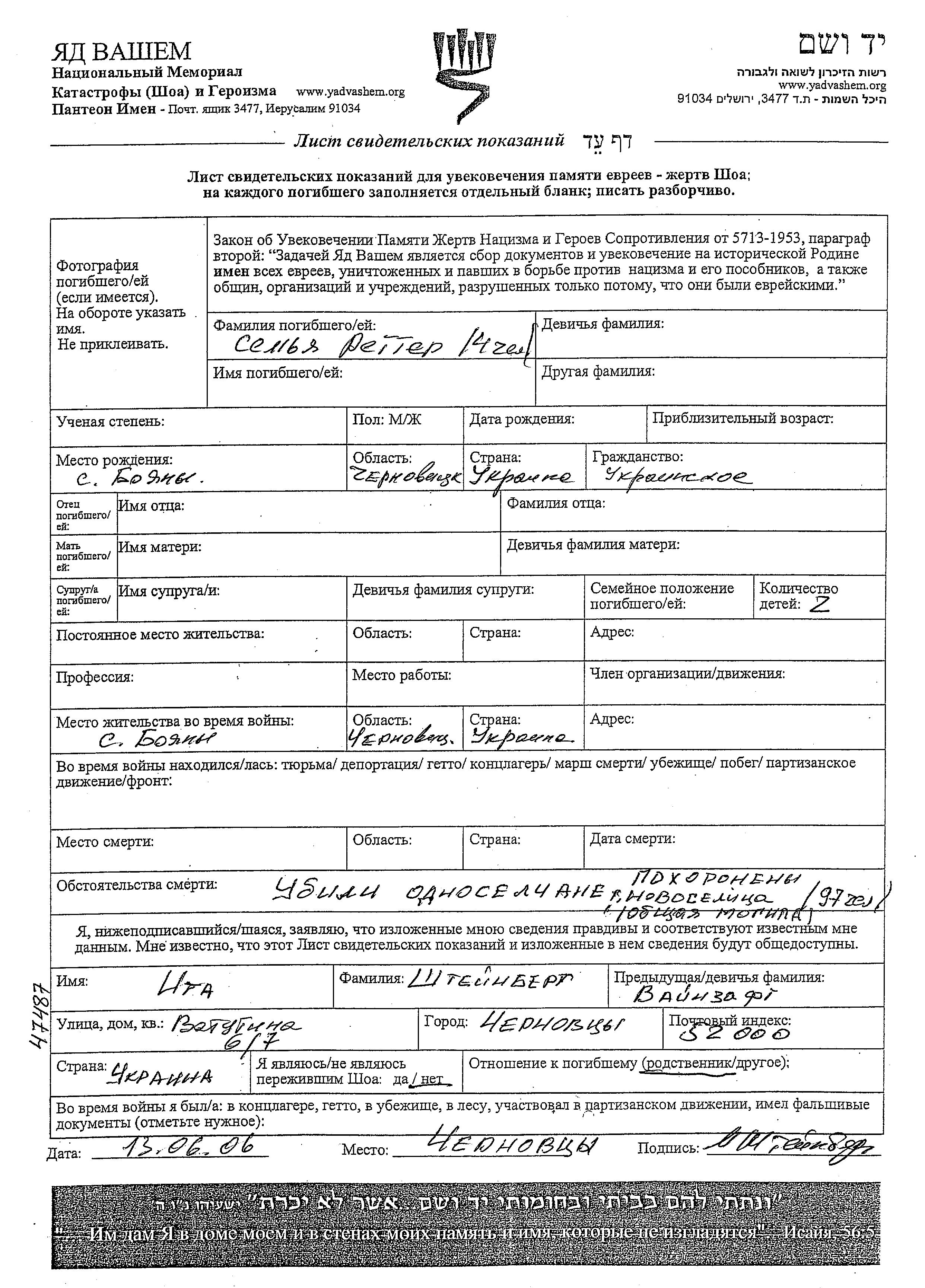 Яд Вашем - Листы свидетельских показаний Мемориального фонда