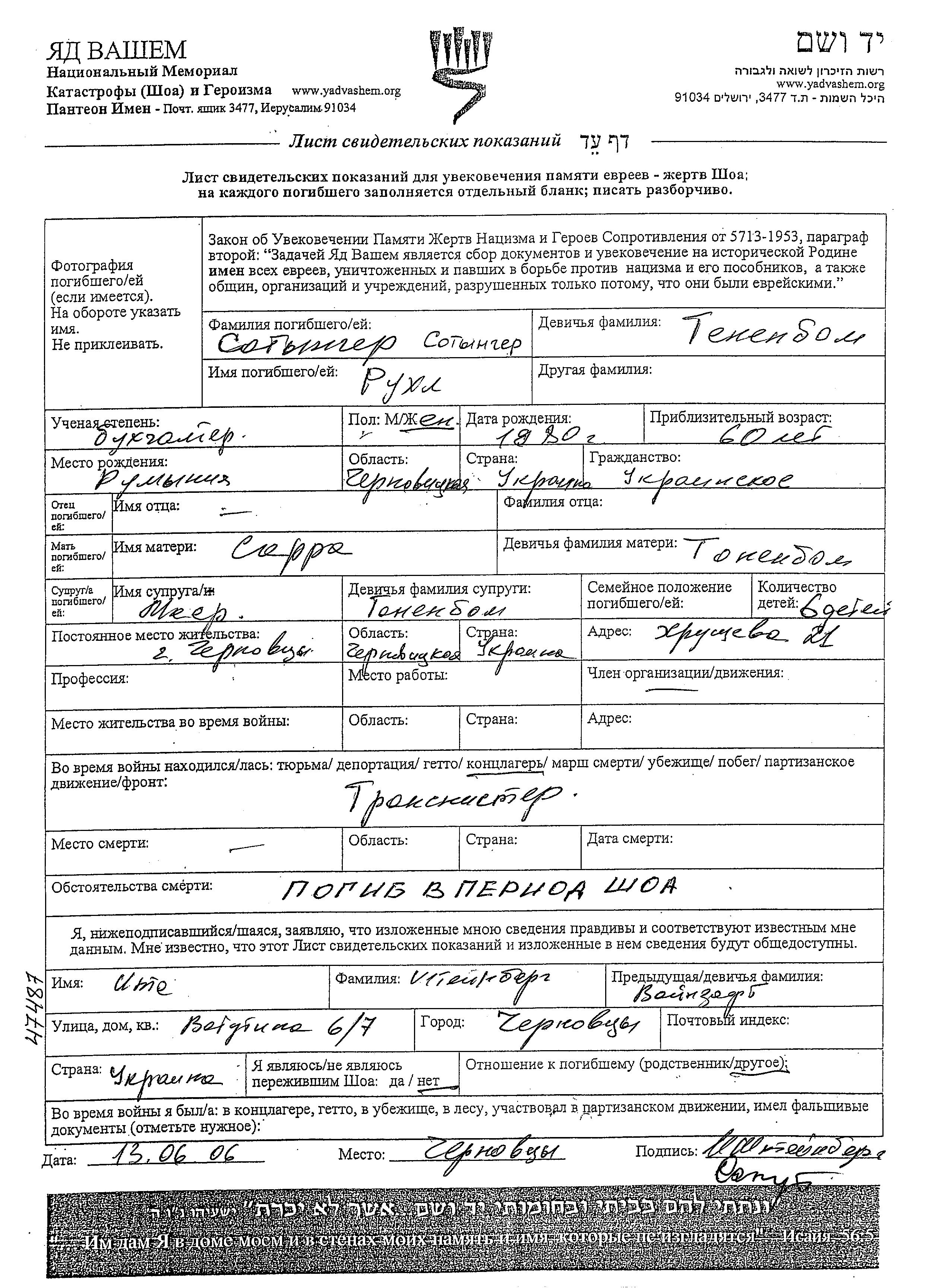Рухл Сотынгер, девичья фамилия Тененбойм, место рождения: Черновцы, Румыния.Mать:Сарра. Женат / замужем. Место жительства до войны: Черновцы, Румыния. Место во время войны: Транснистрия, Украина (СССР).