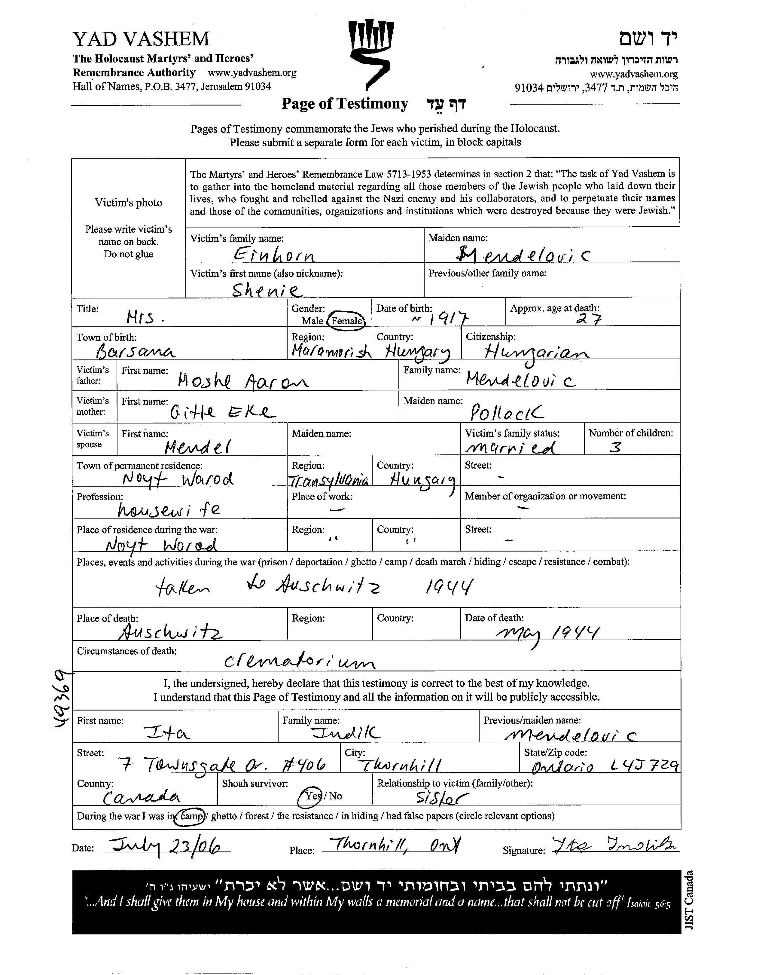 Шение Эйнхорн, девичья фамилия Менделовиц, место рождения: Бырсана, Румыния. Отец: Аарон Моше, mать:Гитте Эке, девичья фамилия Поллок. Домохозяйка. Женат / замужем. Место жительства до войны: Надь-Варад, Румыния. Место во время войны: Надь-Варад, Румыния.
