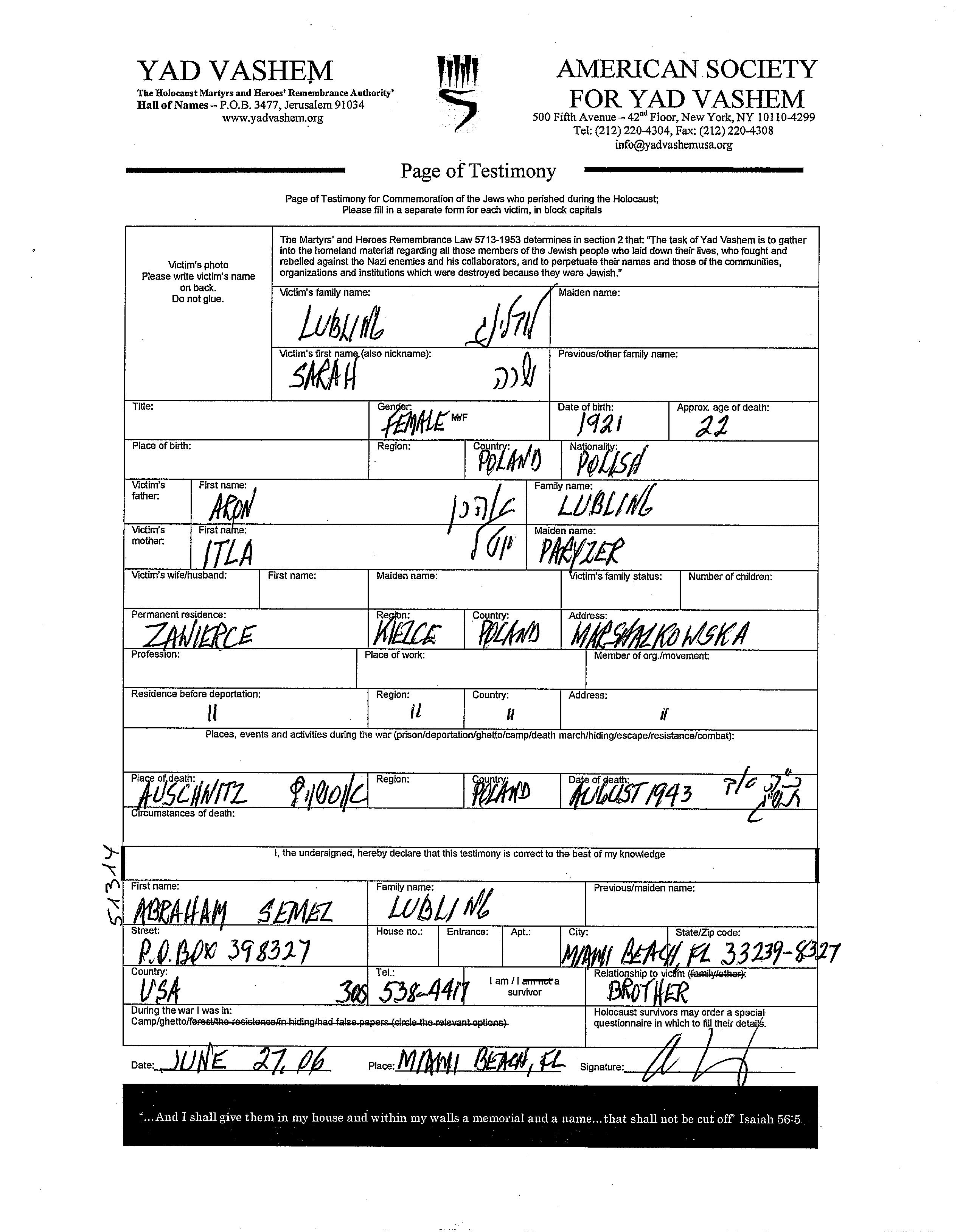 Люблинг Сара 1921 Заверце, Польша Лист свидетельских показаний