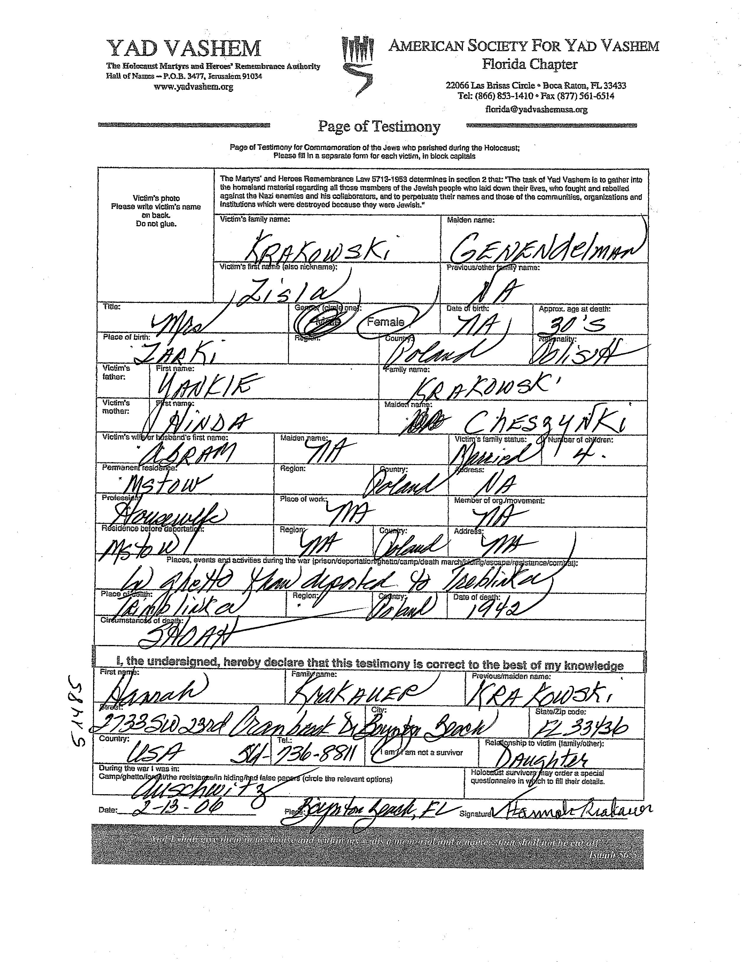 Зисла Краковски, девичья фамилия Генендельман, место рождения: Жарки, Польша. Отец: Янки, mать:Хинда, девичья фамилия Чишиски. Домохозяйка. Женат / замужем. Место жительства до войны: Мстов, Польша. Место во время войны: Мстов, Польша.