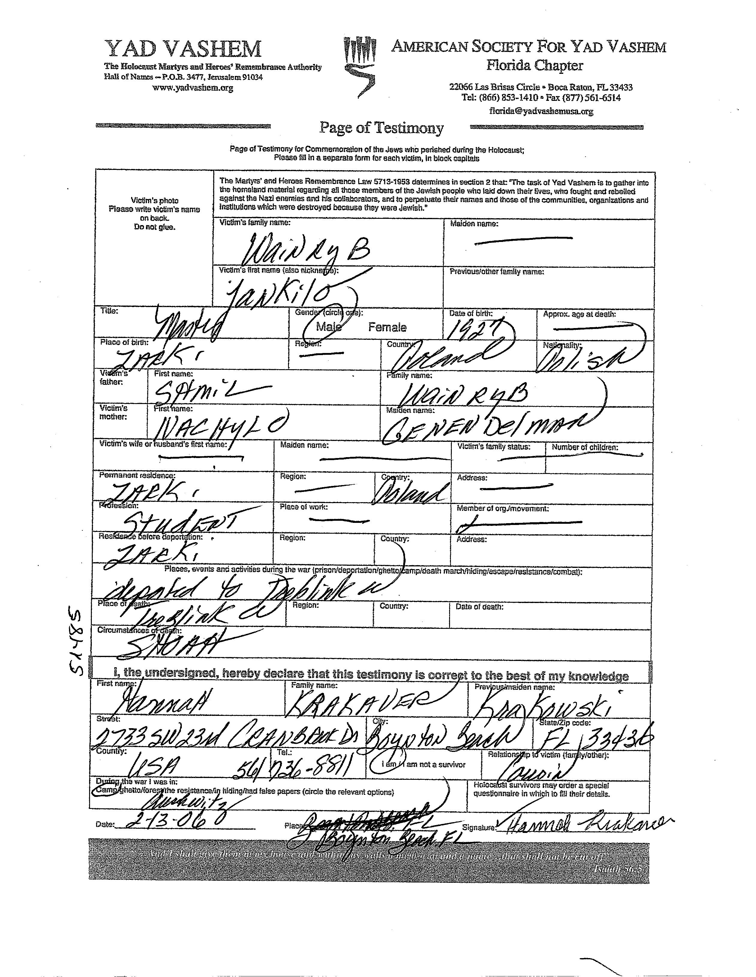 Вайнрыб Янкило 1927 Жарки, Польша Лист свидетельских показаний