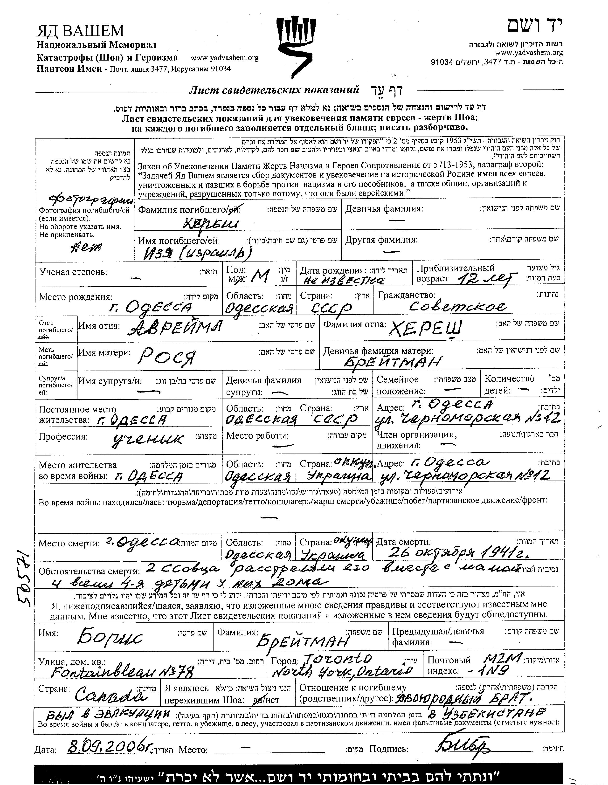 Хереш Изя Одесса, Украина (СССР) Лист свидетельских показаний