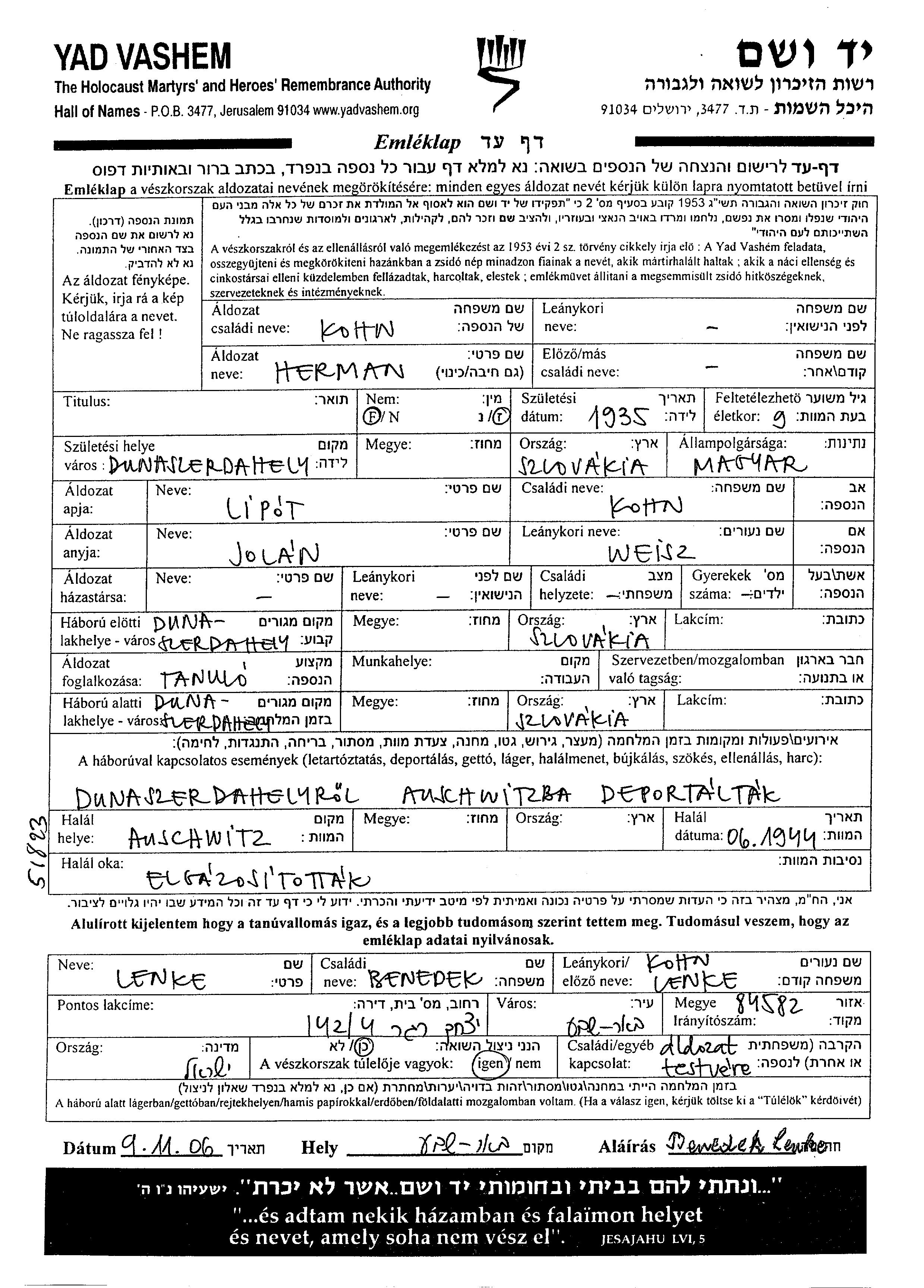 Херман уничтожен в период Шоа. место смерти: Аушвиц, Польша в 06/1944.