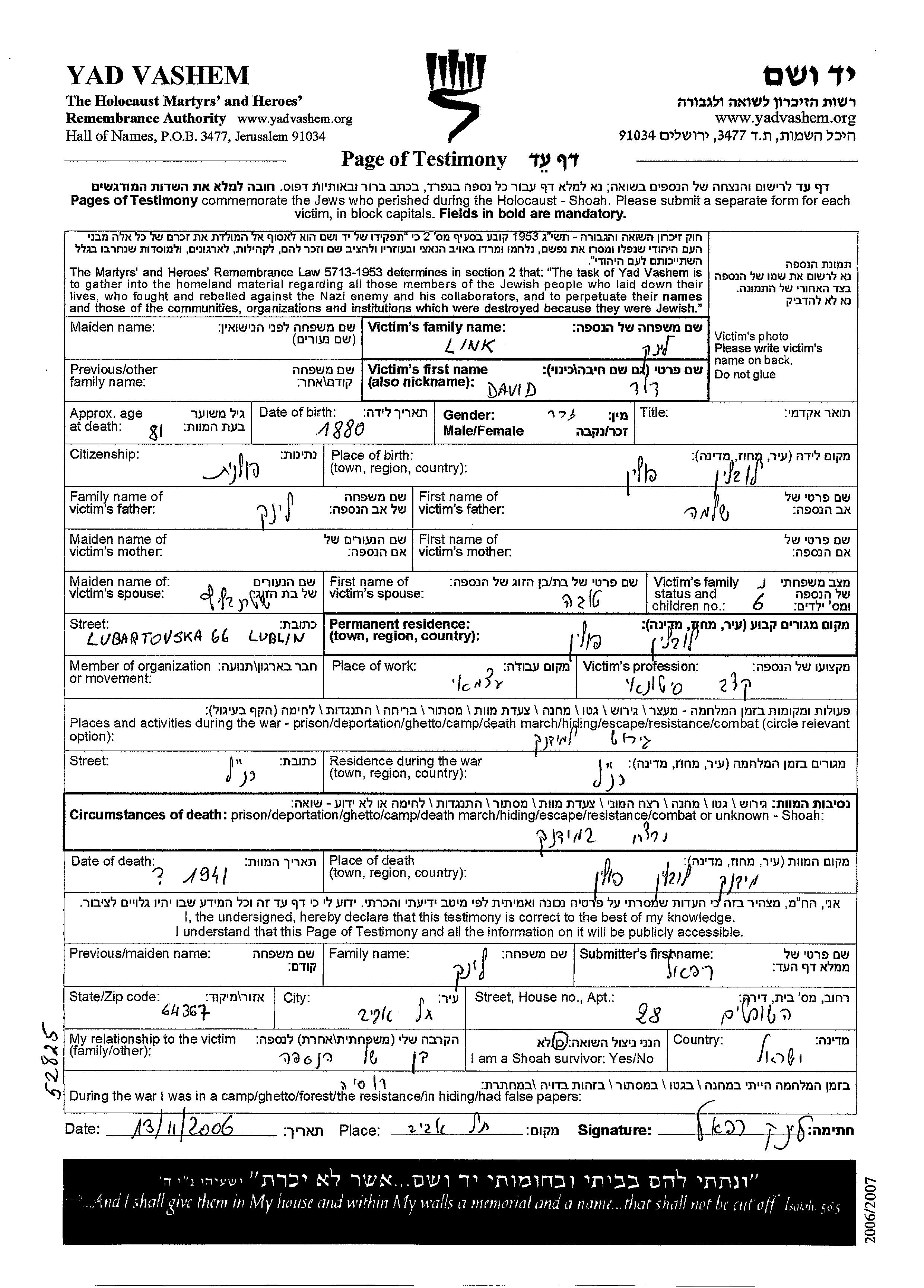 Давид Линк, место рождения: Люблин, Польша. Отец: Шломо. Мясник. Женат / замужем. Место жительства до войны: Люблин, Польша. Место во время войны: Люблин, Польша.