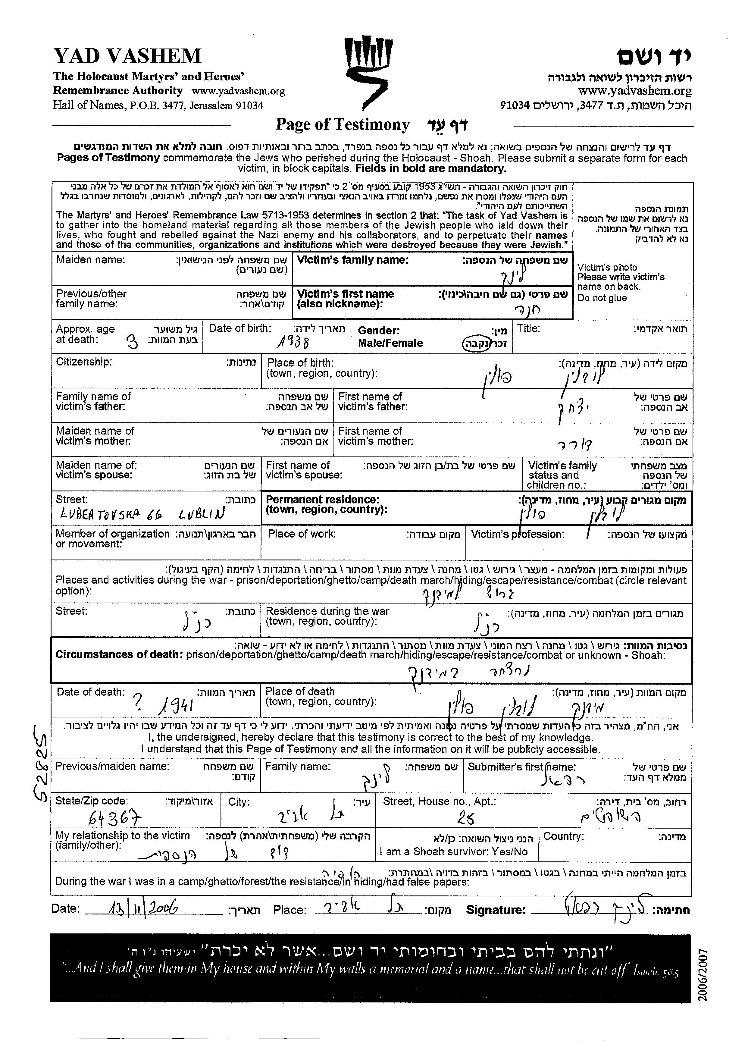 Линк Хана 1938 Люблин, Польша Лист свидетельских показаний