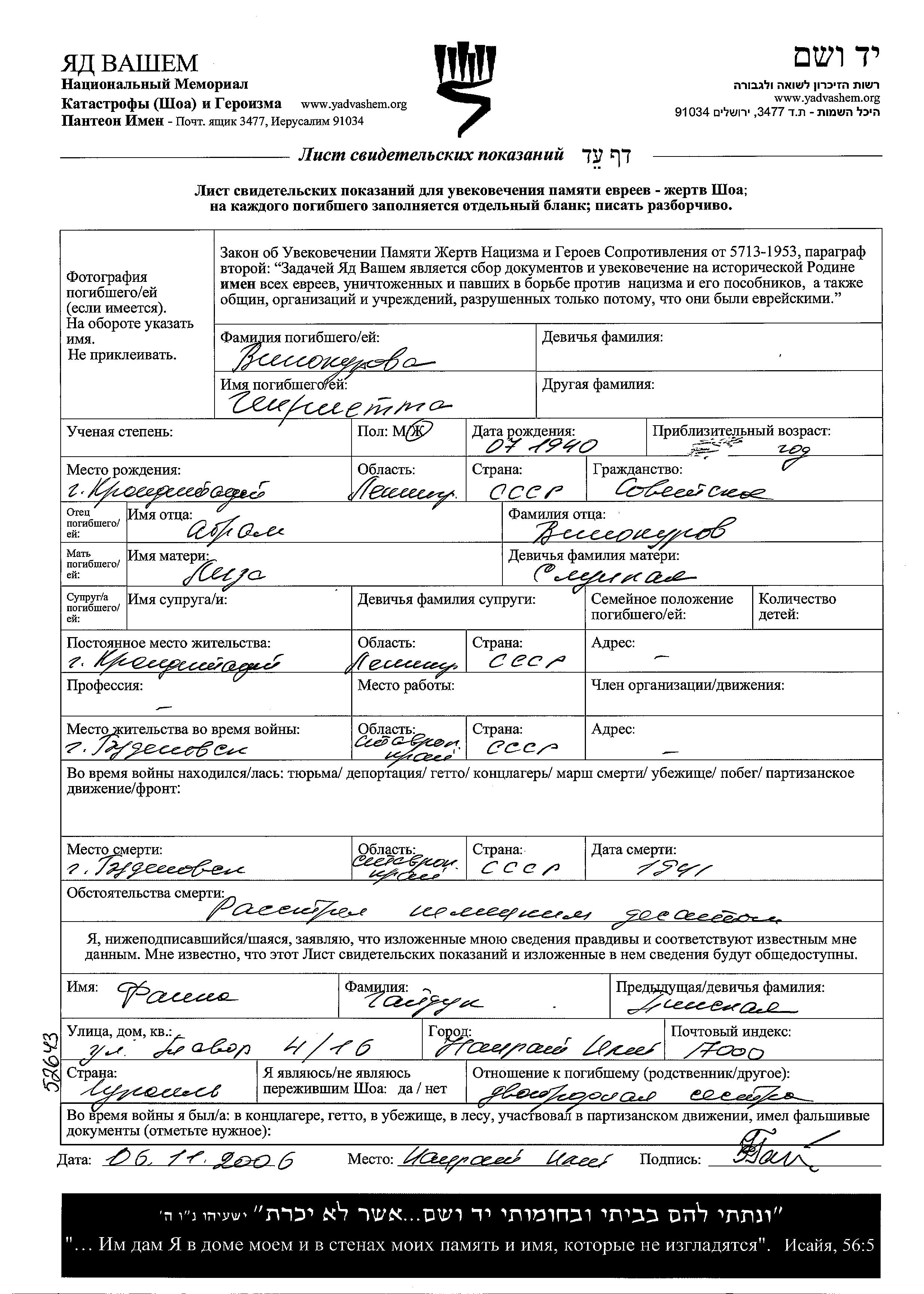 Яд Вашем - Листы свидетельских показаний Мемориального фонда