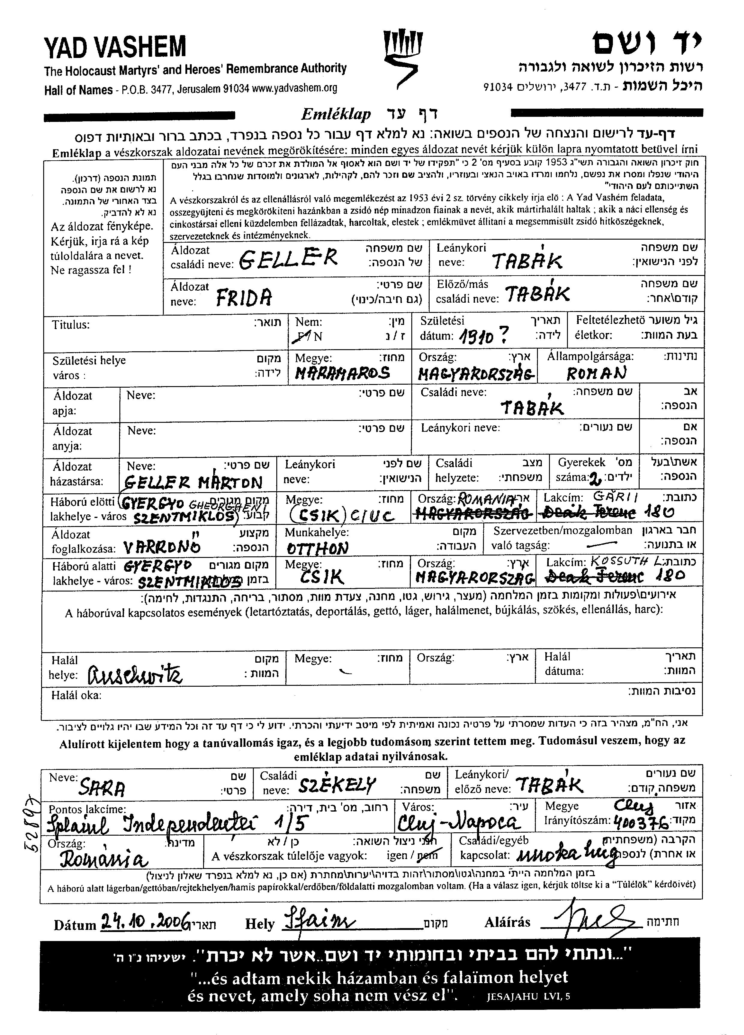 Фрида Табак, девичья фамилия Геллер, место рождения: Марамарос, Румыния. Швея. Женат / замужем. Место жительства до войны: Дьердьёсентмиклош, Румыния. Место во время войны: Дьердьёсентмиклош, Румыния.