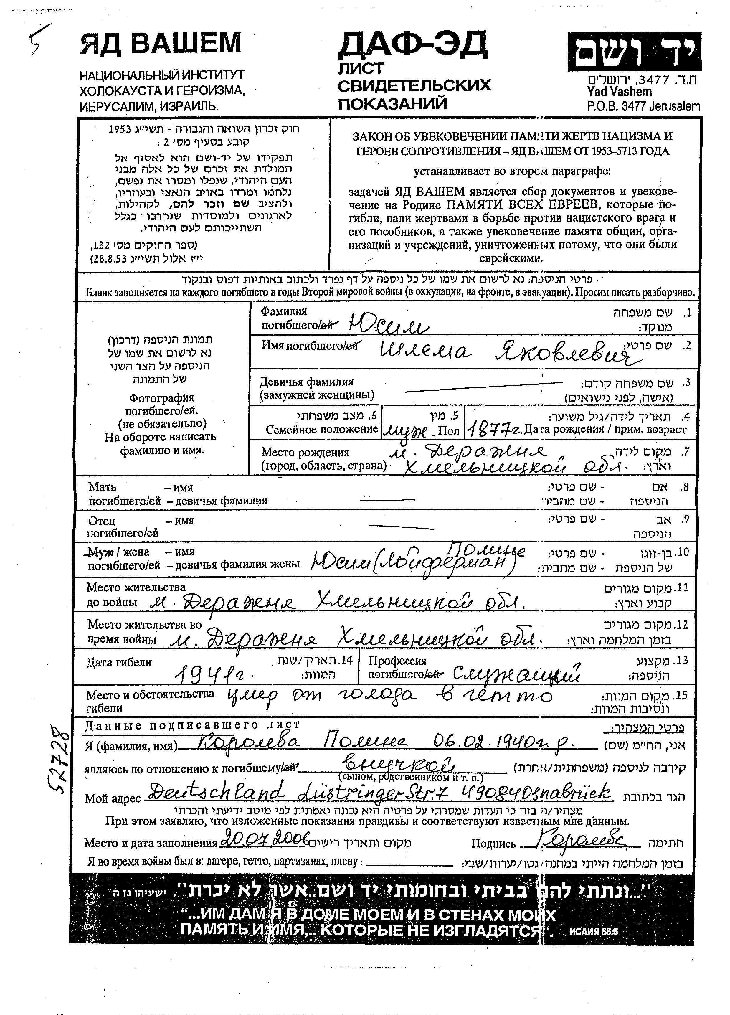 Яд Вашем - Листы свидетельских показаний Мемориального фонда