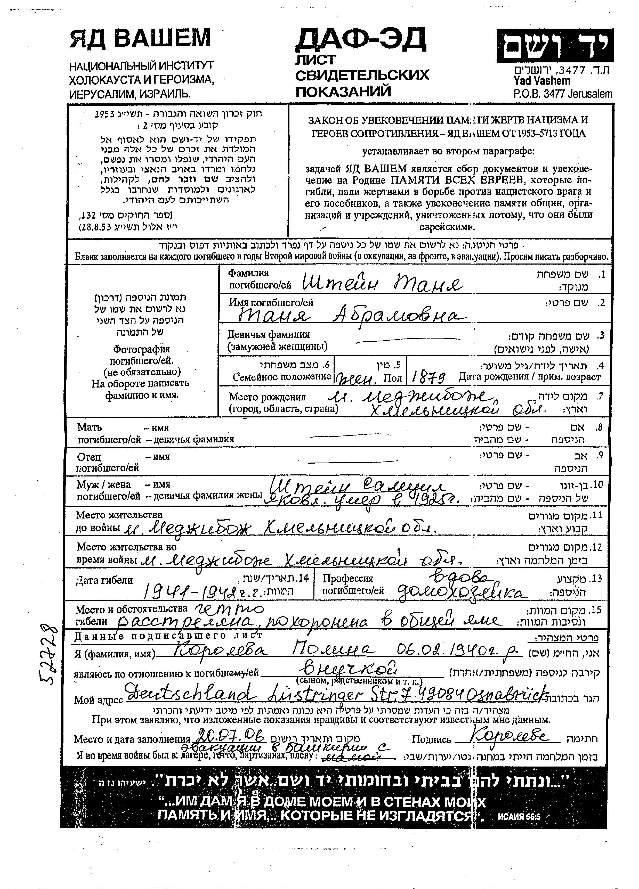 Штейн Таня 1879 Меджибож, Украина (СССР) Лист свидетельских показаний