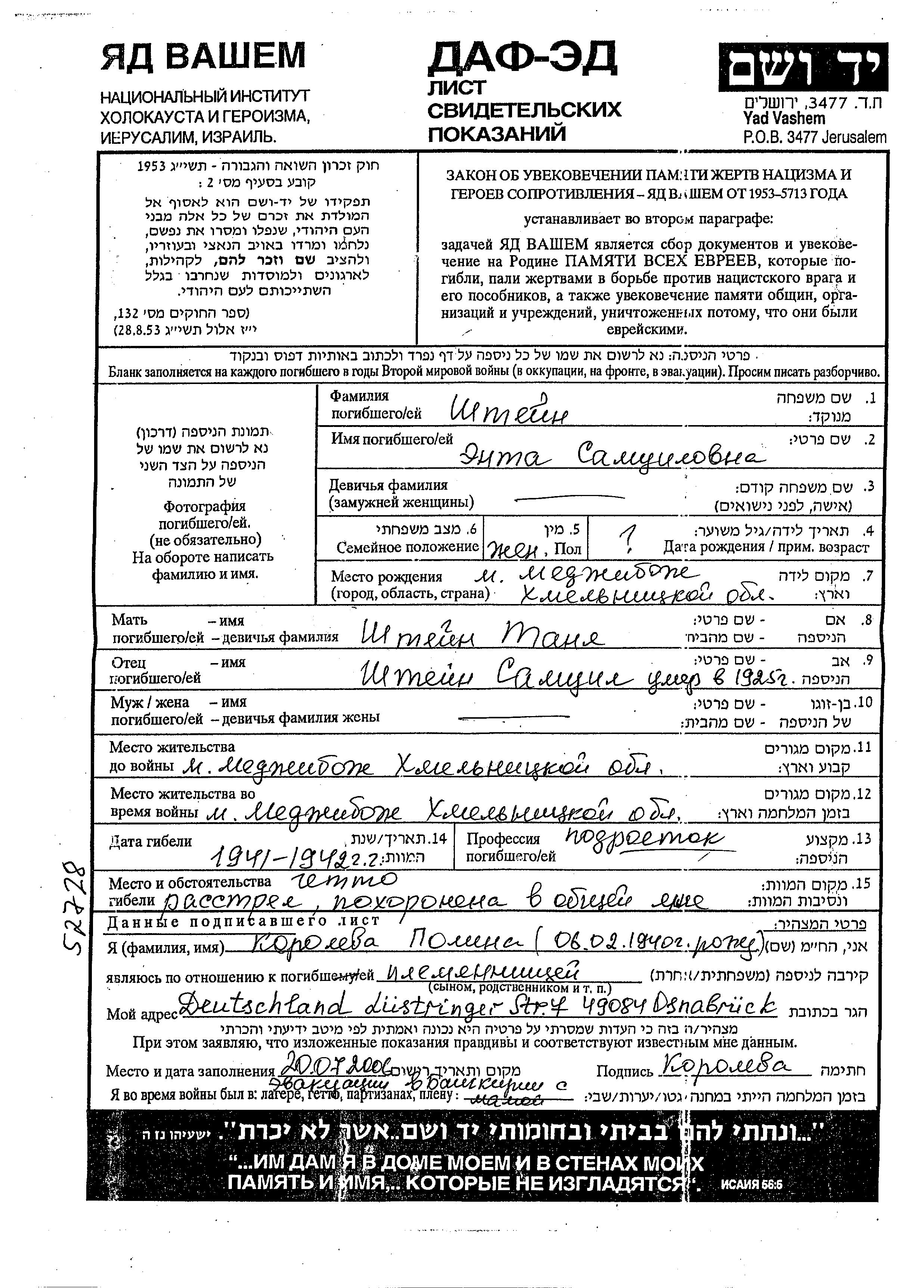 Яд Вашем - Листы свидетельских показаний Мемориального фонда