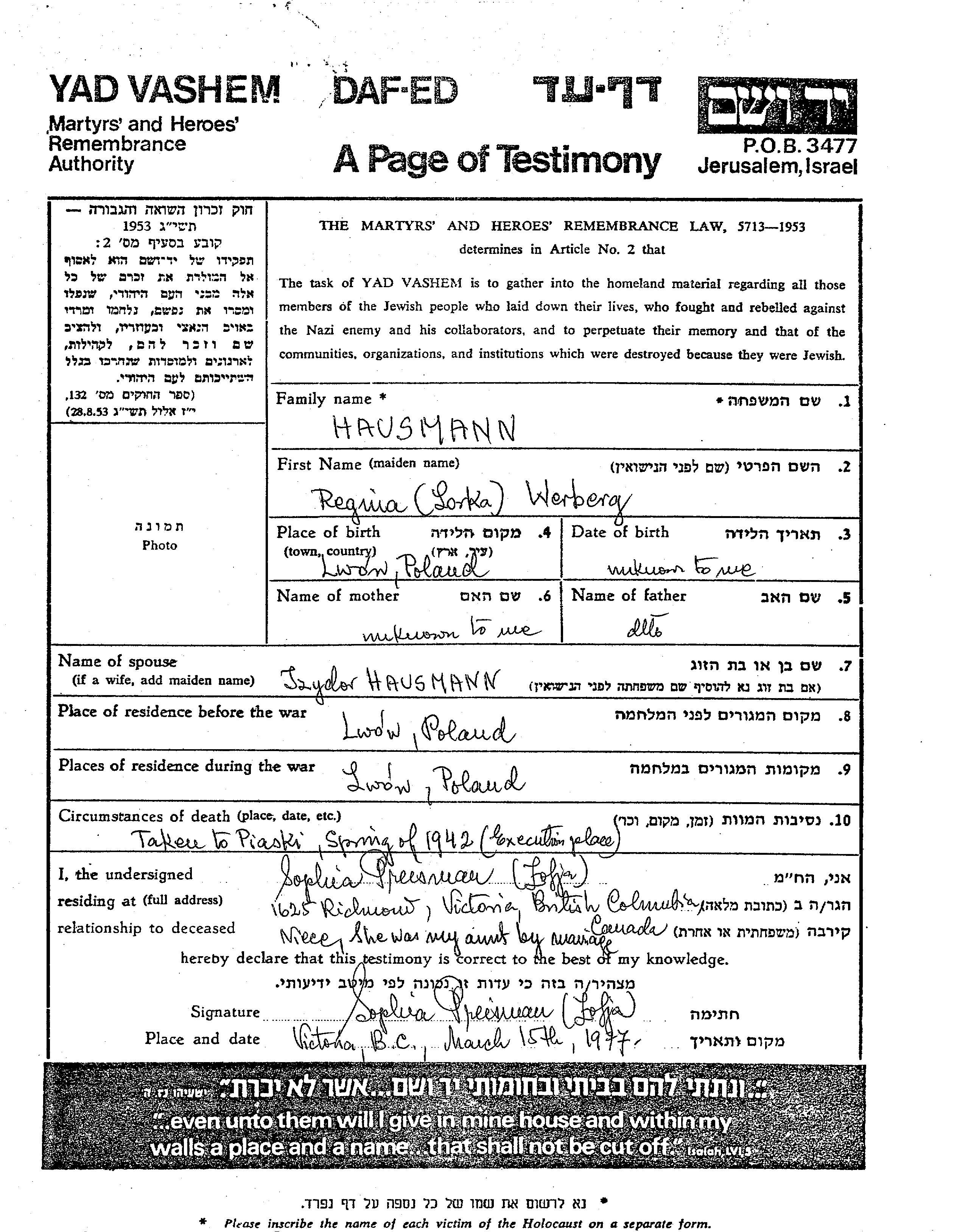 Регина Сорка Хаусманн, девичья фамилия Верберг, место рождения: Львов, Польша. Женат / замужем. Место жительства до войны: Львов, Польша. Место во время войны: Львов, Польша.