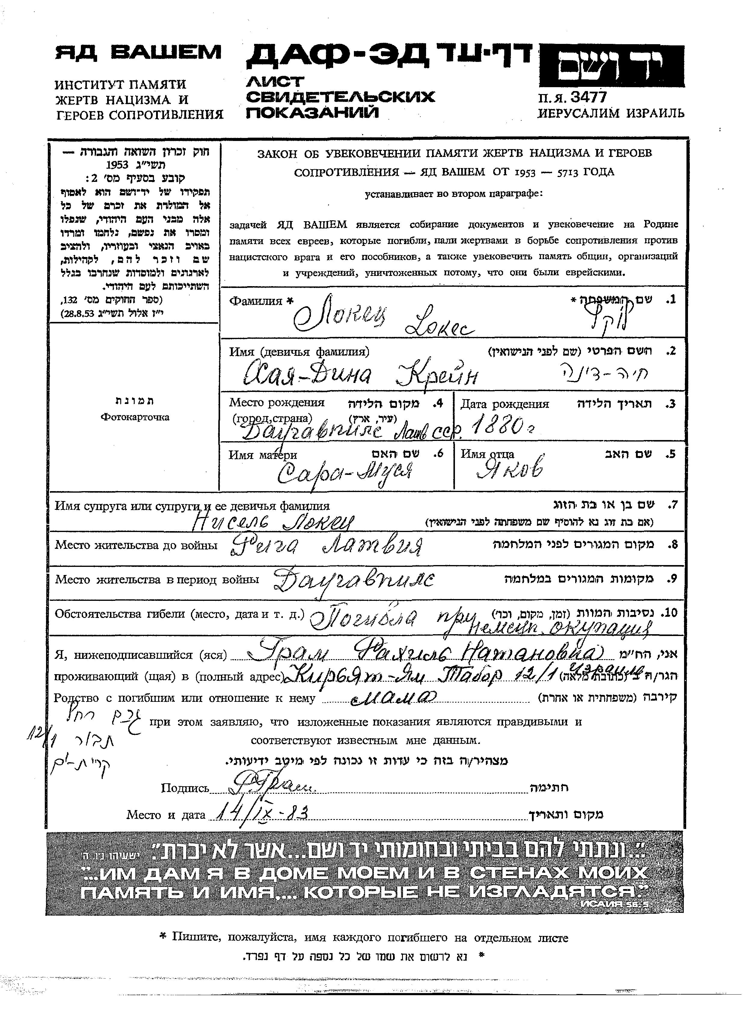 Локец Лукач Хая Дина 1880 Рига, Латвия Лист свидетельских показаний