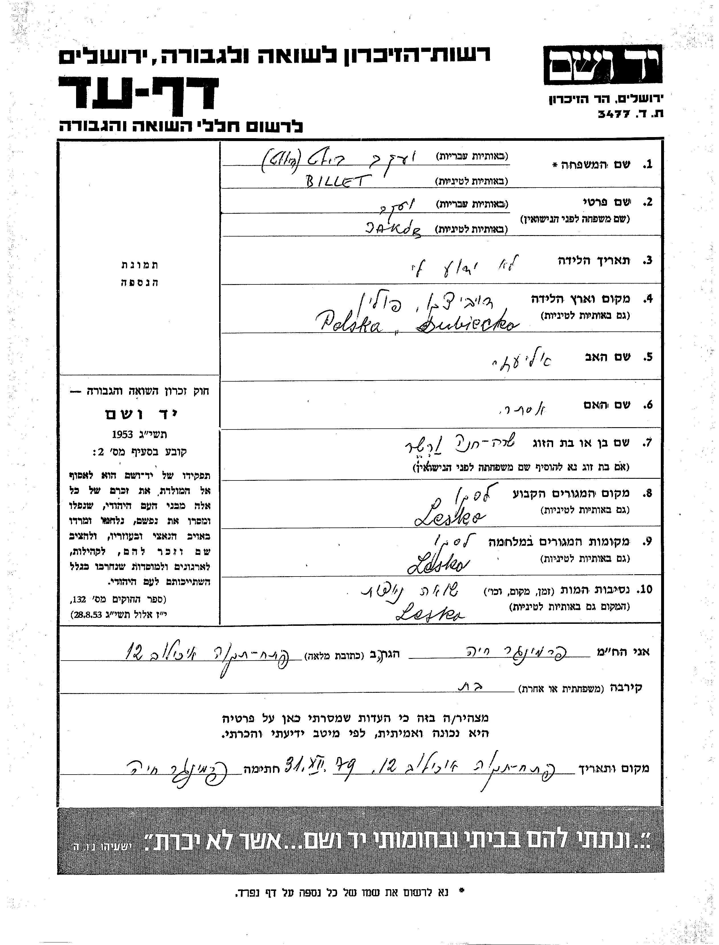 Якоб Биллет, место рождения: Дубецко, Польша. Отец: Элиэзер, mать:Эстер. Женат / замужем. Место жительства до войны: Леско, Польша. Место во время войны: Леско, Польша.