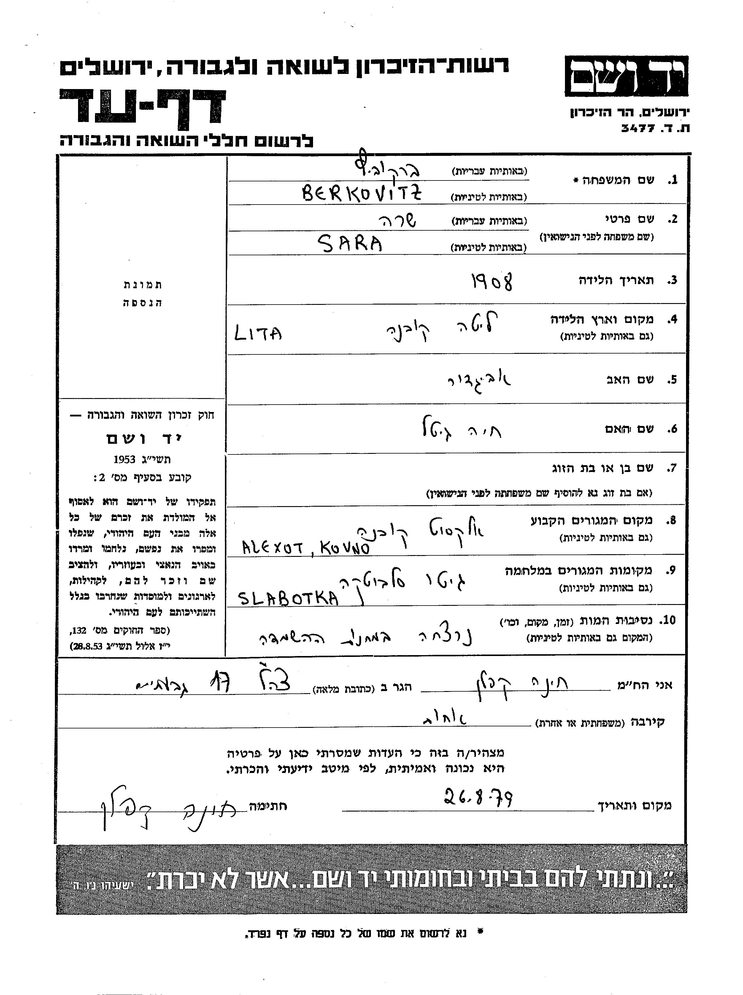 Сара Берковиц, место рождения: Ковно, Литва. Отец: Авигдор, mать:Хая Гитель. Место жительства до войны: Ковно, Литва. Место во время войны: Слободка.