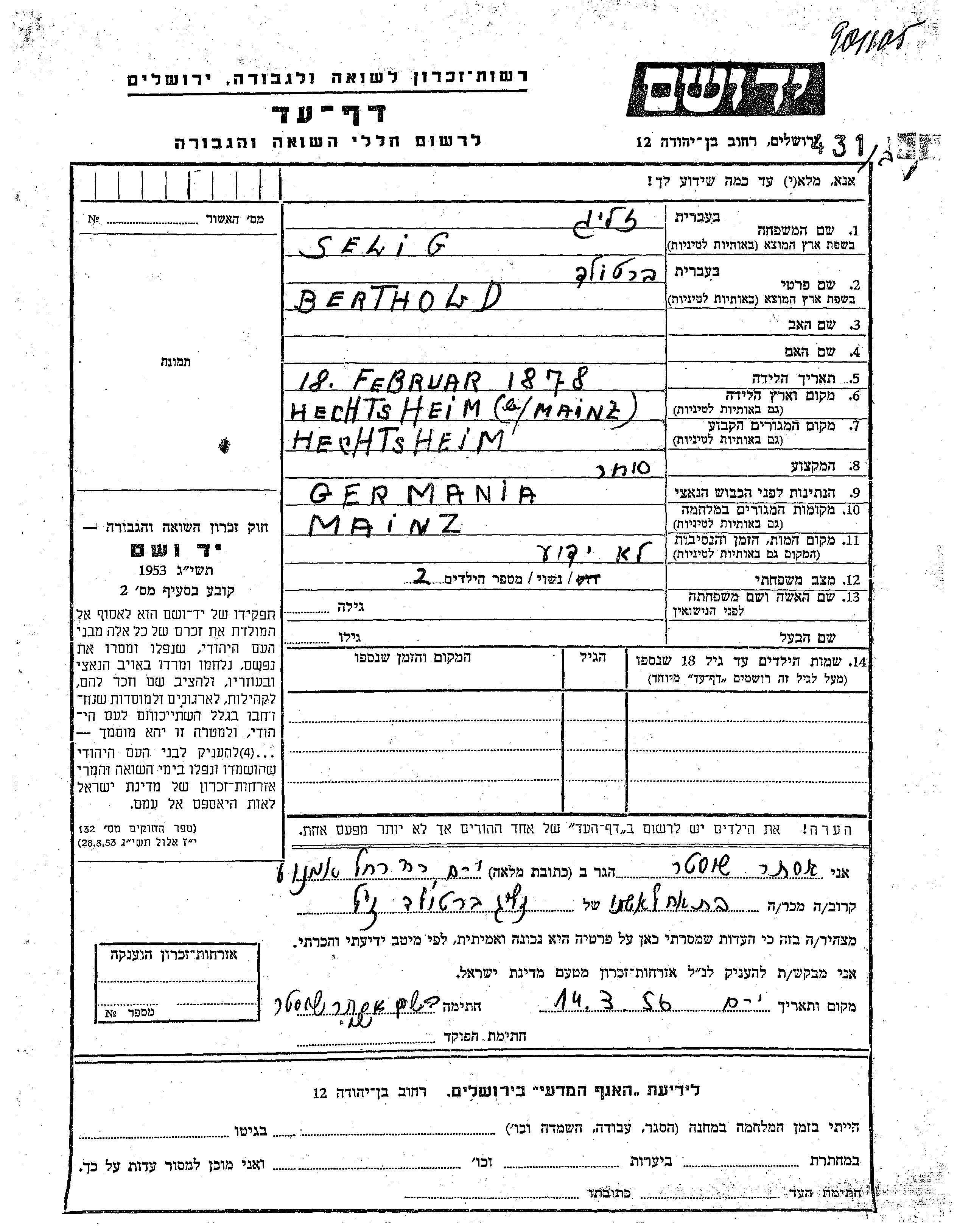 Бертольд Зелиг, место рождения: Хезтсхейм, Германия. Торговец / торговка. Женат / замужем. Место жительства до войны: Хезтсхейм, Германия. Место во время войны: Майнц, Германия.