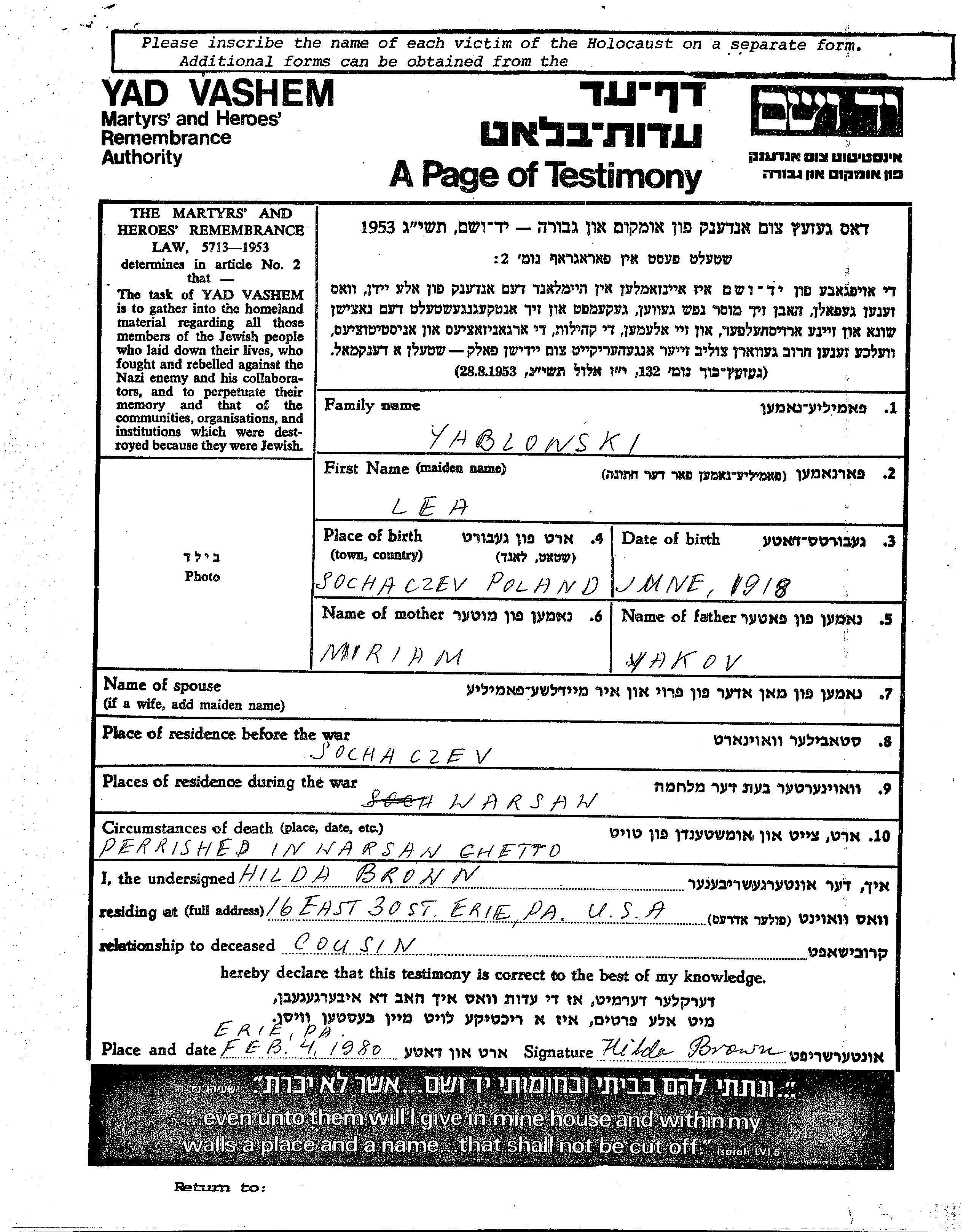 Лея Яблонский, место рождения: Сохачев, Польша. Отец: Яков, mать:Мирьям. Место жительства до войны: Сохачев, Польша. Место во время войны: Варшава, Польша.