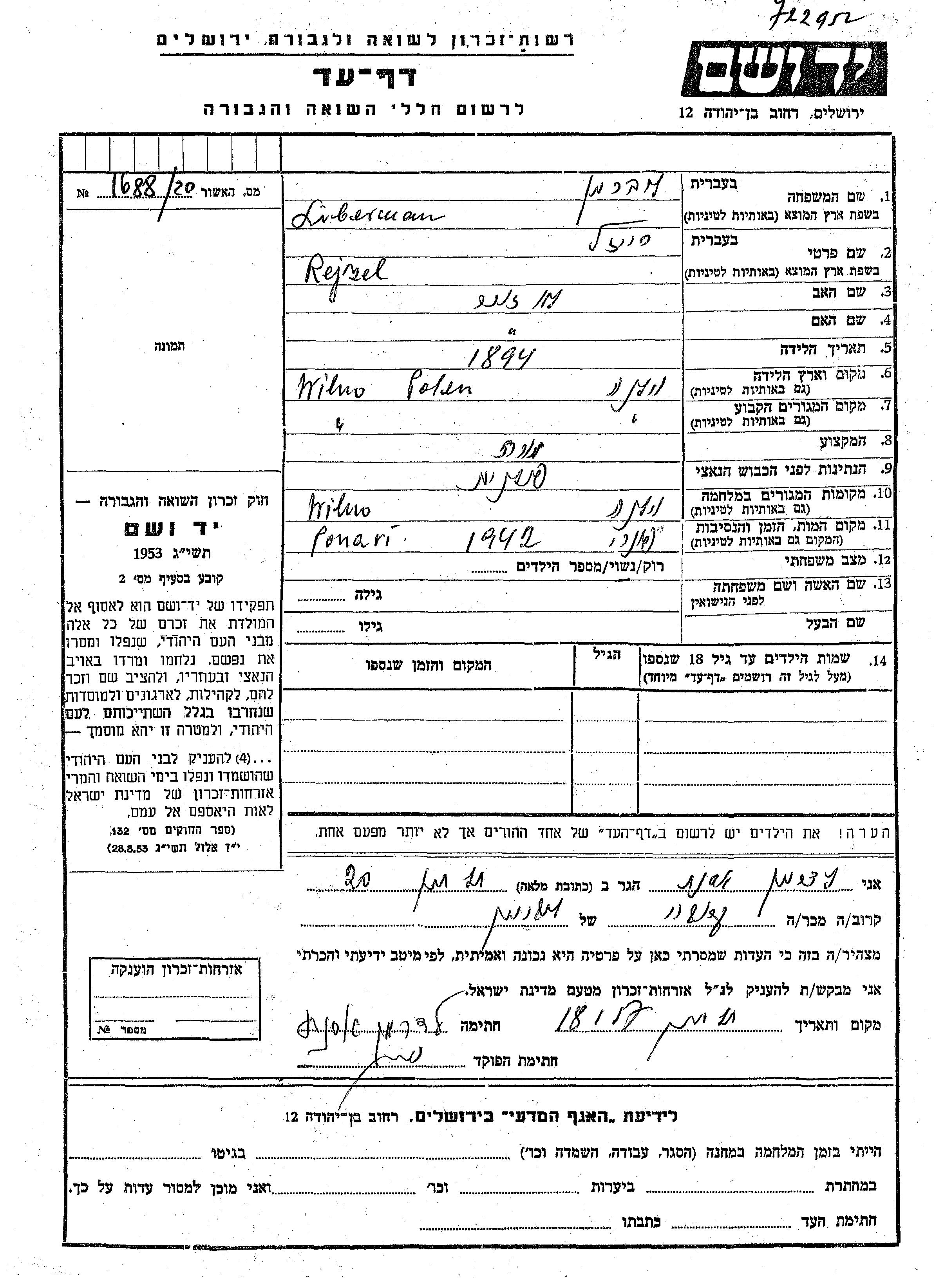 Рейзел Либерман, место рождения: Вильно, Польша. Учитель / учительница. Женат / замужем. Место жительства до войны: Вильно, Польша. Место во время войны: Вильно, Польша.