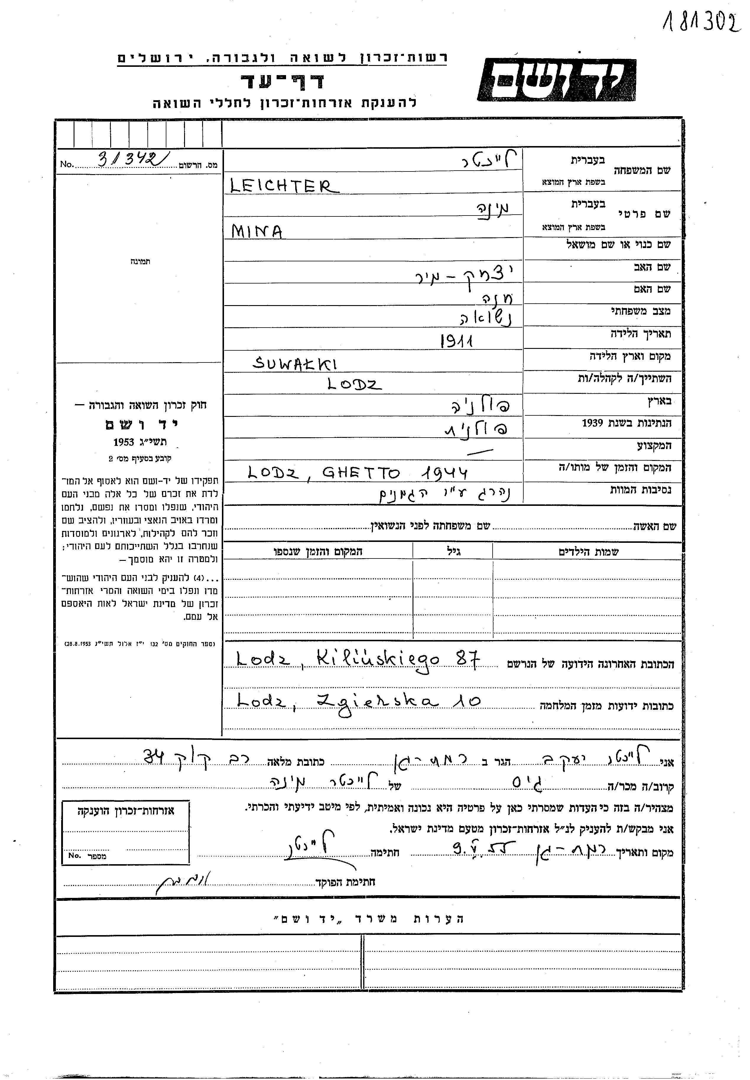 Мина Лейхтер, место рождения: Сувалки, Польша. Отец: Ицхак Мир, mать:Хана. Женат / замужем. Место жительства до войны: Лодзь, Польша. Место во время войны: Лодзь, Польша.