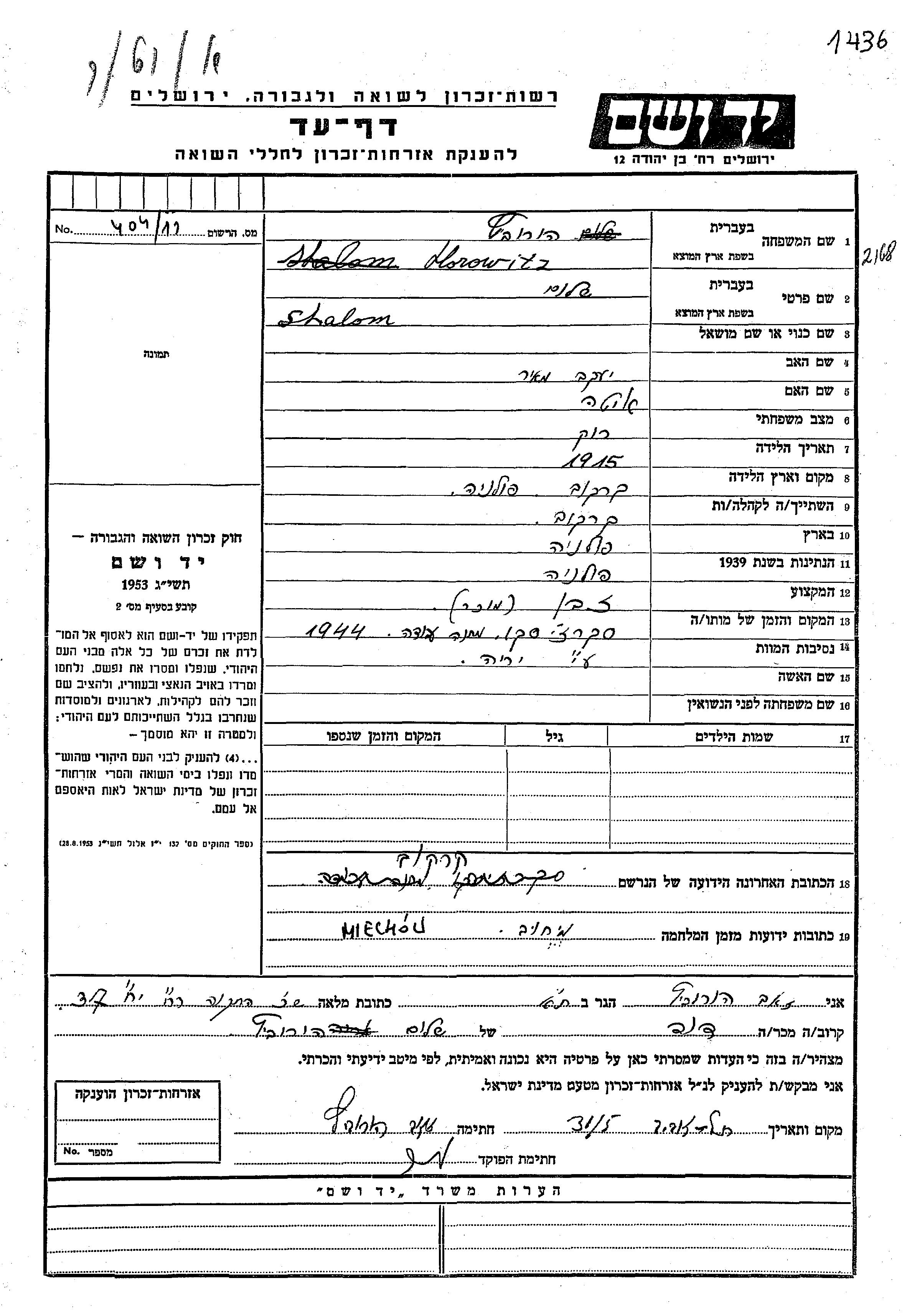 Шалом Хоровиц, место рождения: Краков, Польша. Отец: Яков Меир, mать:Ита. Продавец / продавщица. Холост / не замужем. Место жительства до войны: Краков, Польша. Место во время войны: Мехув, Польша.