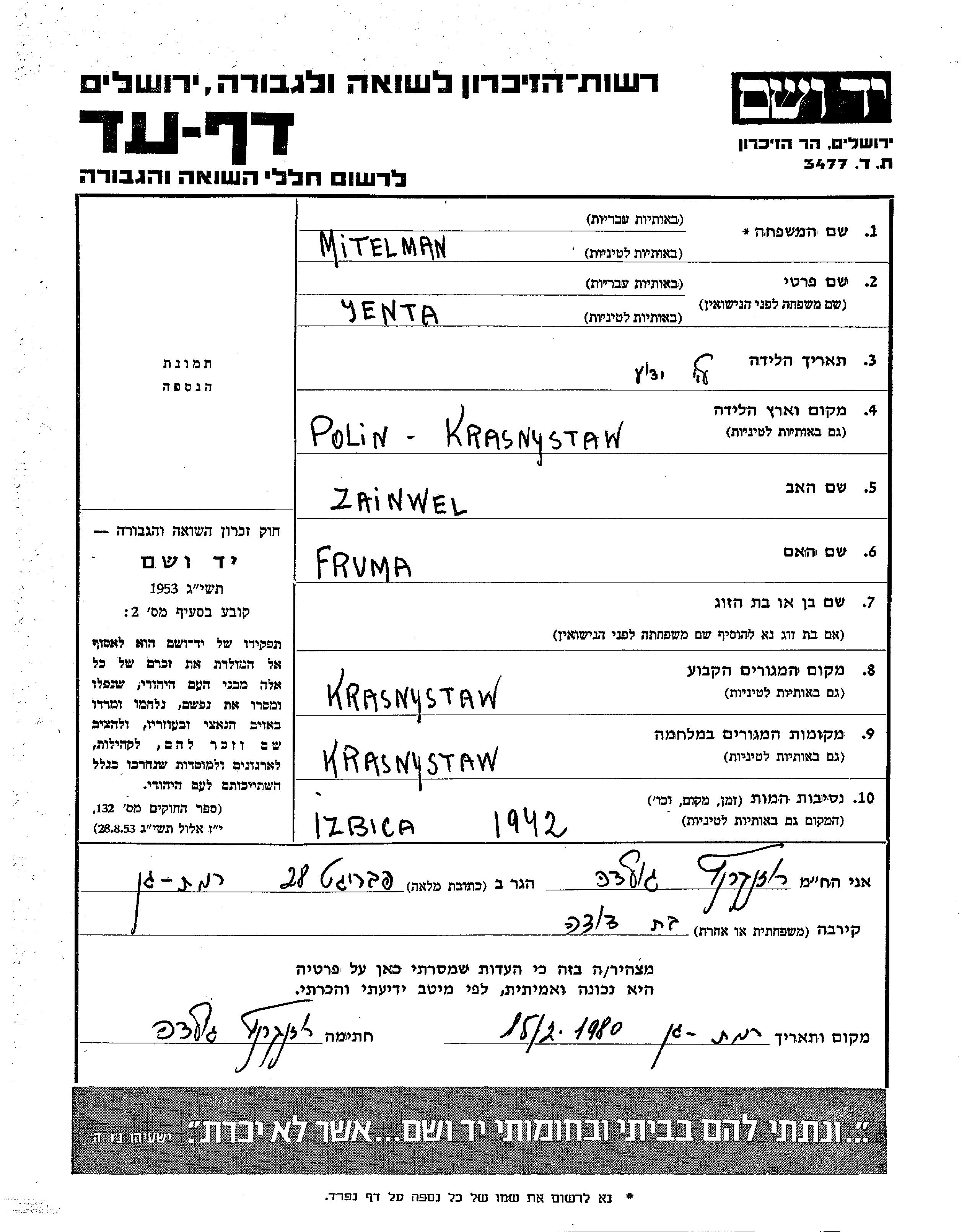Ента Мительман, место рождения: Красныстав, Польша. Отец: Зайнвель, mать:Фрума. Место жительства до войны: Красныстав, Польша. Место во время войны: Красныстав, Польша.
