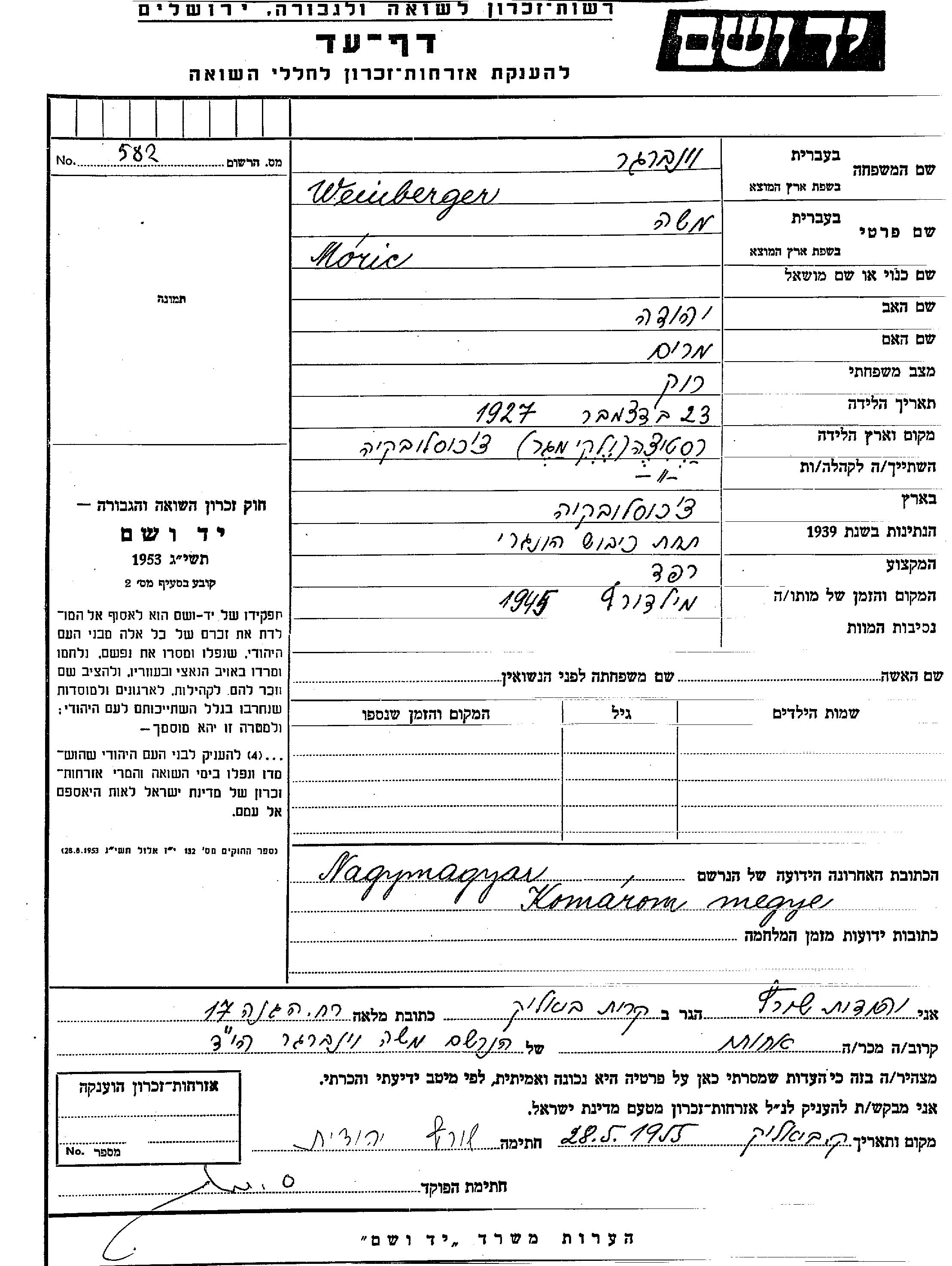Мориц Моше Вейнбергер, место рождения: Растице, Чехословакия. Отец: Иегуда, mать:Мирьям. Обойщик. Место жительства до войны: Надьмадьяр, Чехословакия. Место во время войны: Комаром.