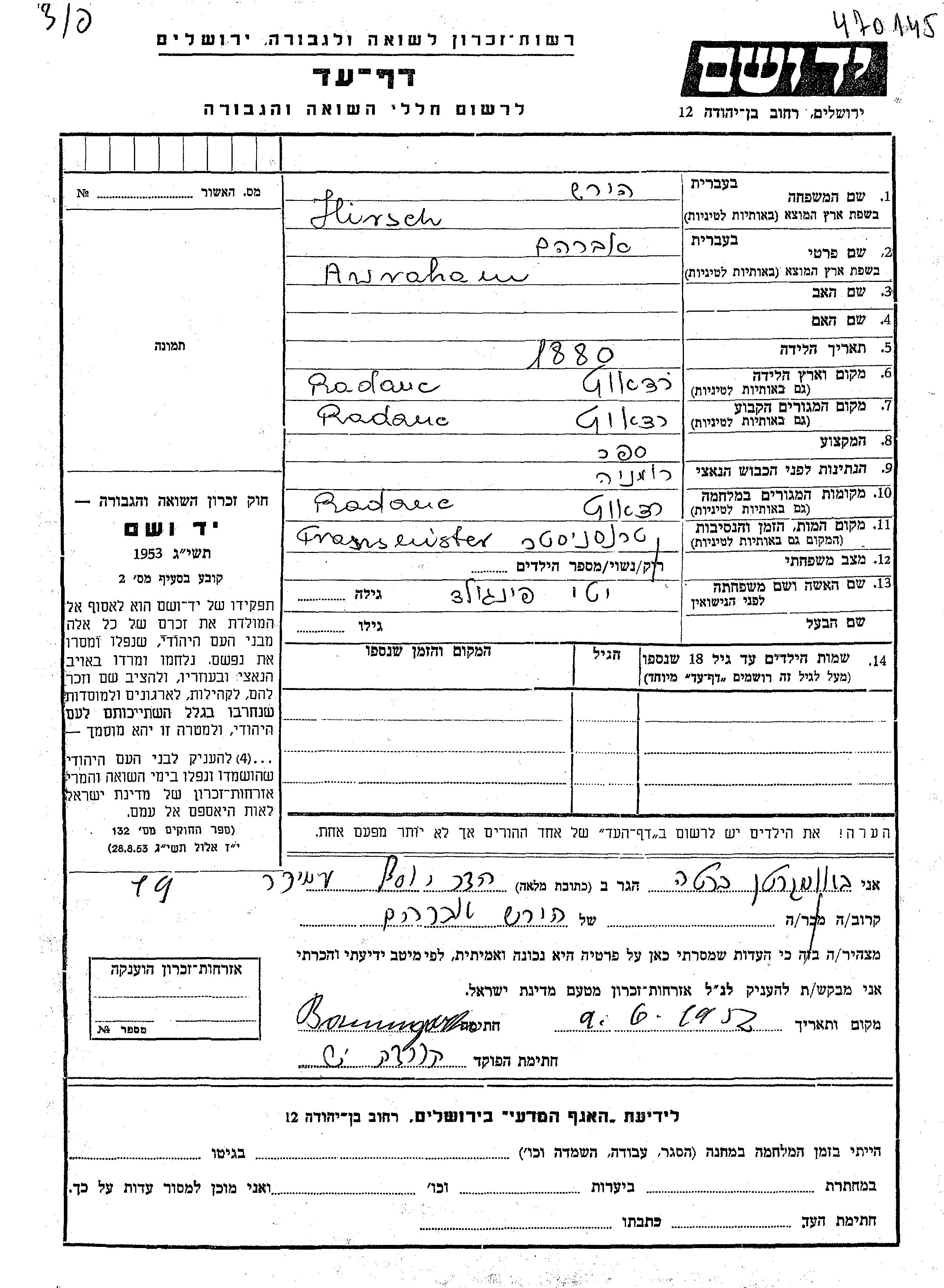 Авраам Хирш, место рождения: Радауц, Румыния. Парикмахер. Женат / замужем. Место жительства до войны: Радауц, Румыния. Место во время войны: Радауц, Румыния.
