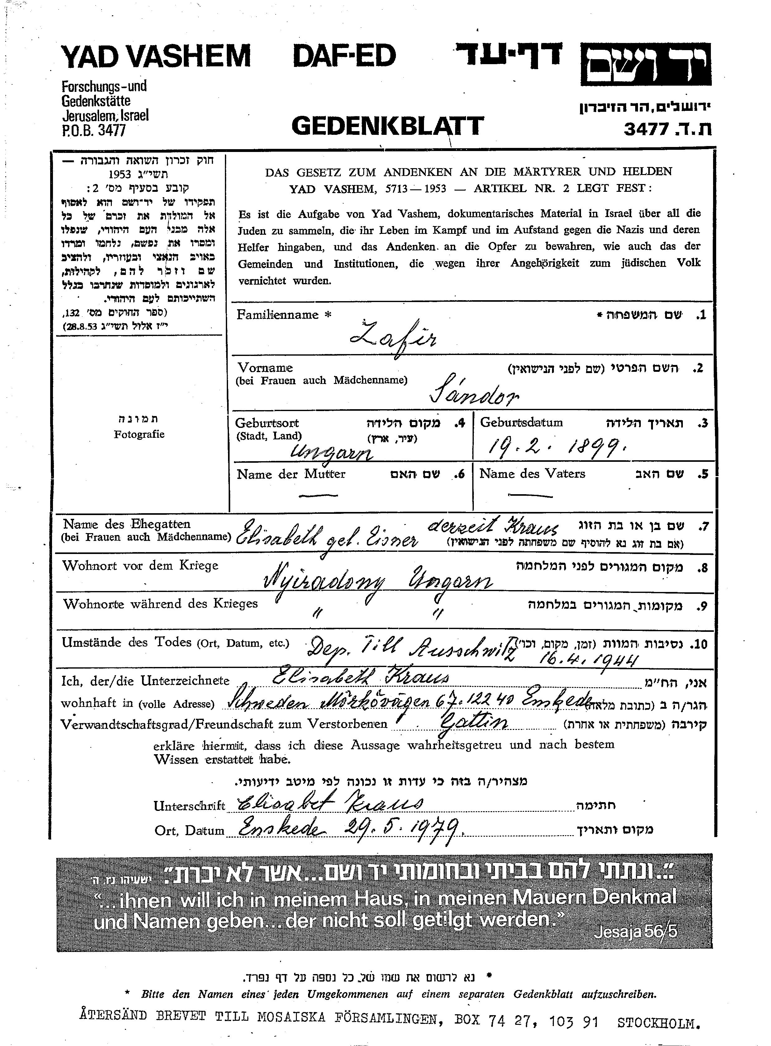 Сандор Зафир, место рождения: Венгрия. Женат / замужем. Место жительства до войны: Ньирадонь, Венгрия. Место во время войны: Ньирадонь, Венгрия.
