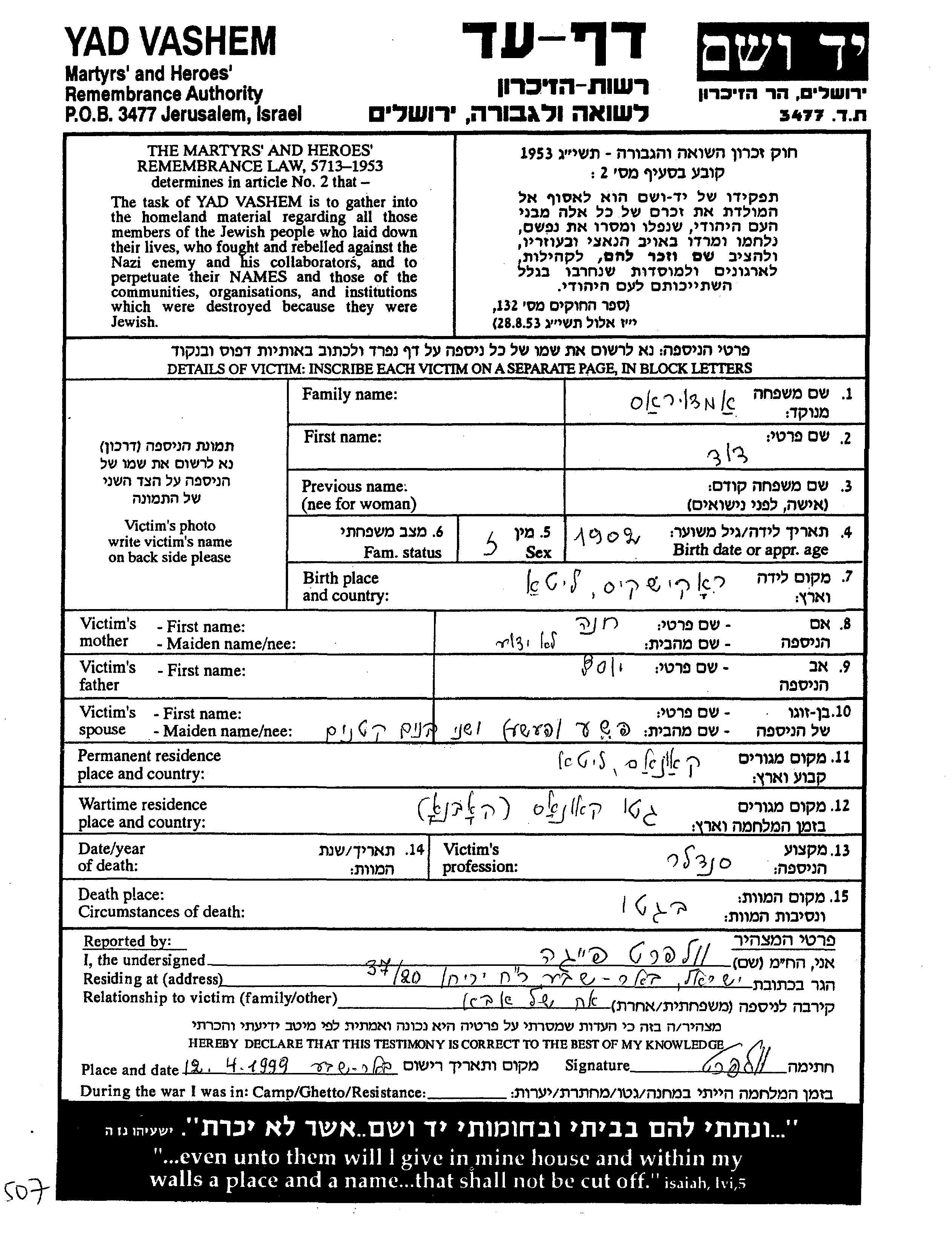 Яд Вашем - Листы свидетельских показаний Мемориального фонда