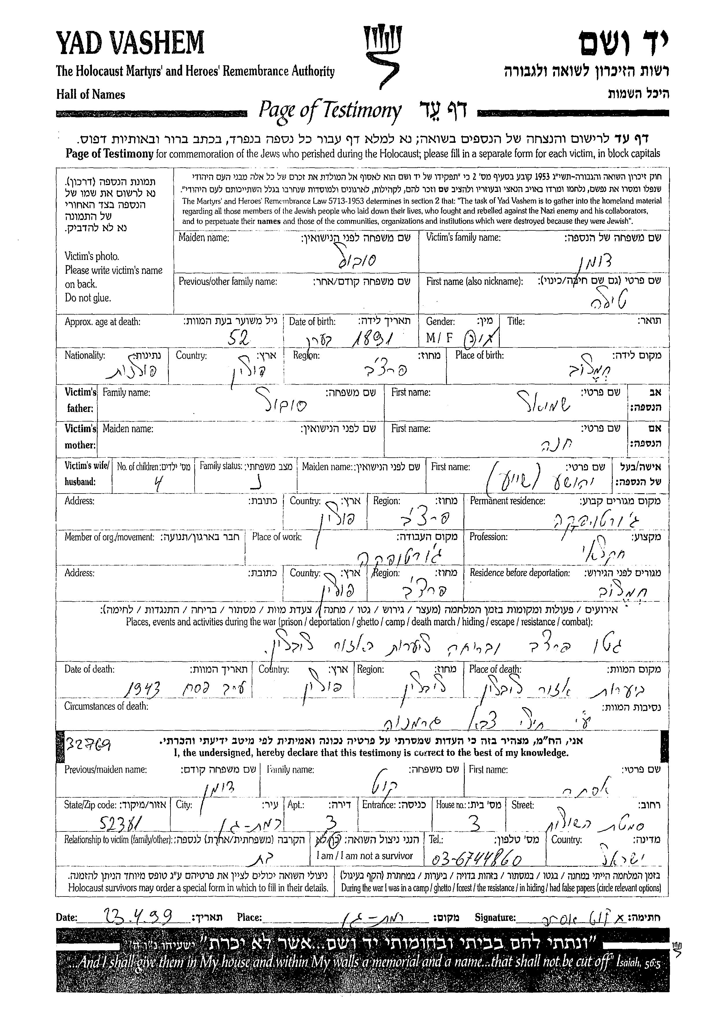 Тила уничтоженa в период Шоа. место смерти: Люблин, Польша в 19/04/1943.