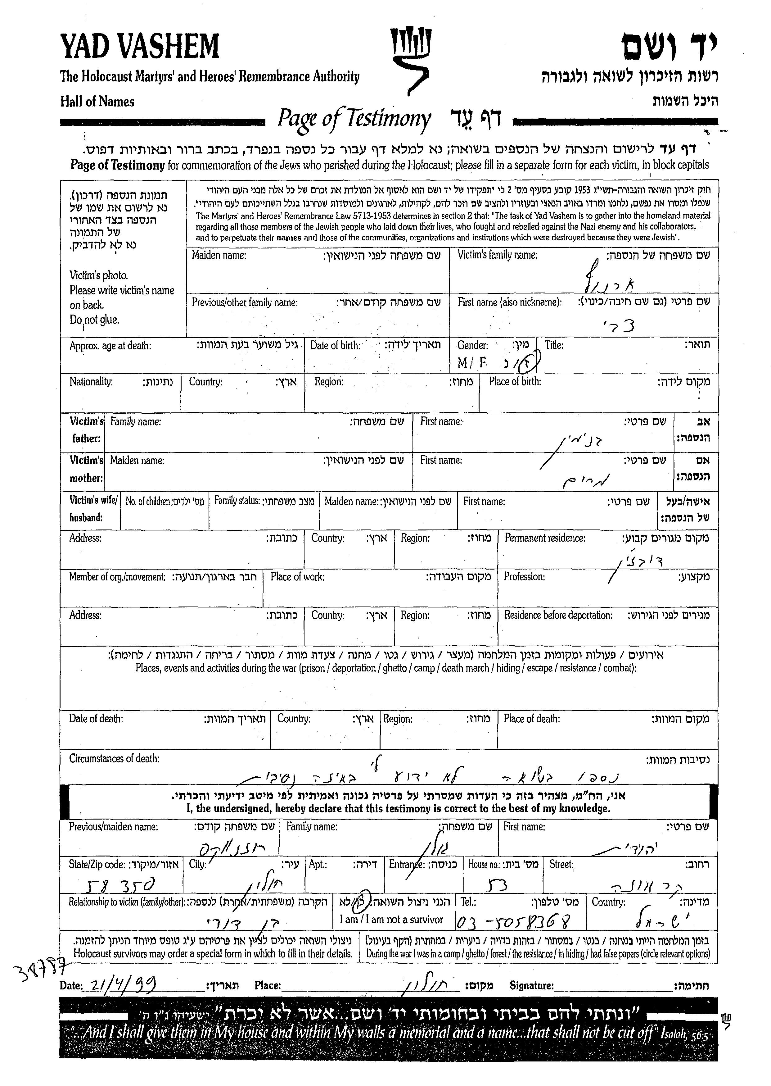 Яд Вашем - Листы свидетельских показаний Мемориального фонда