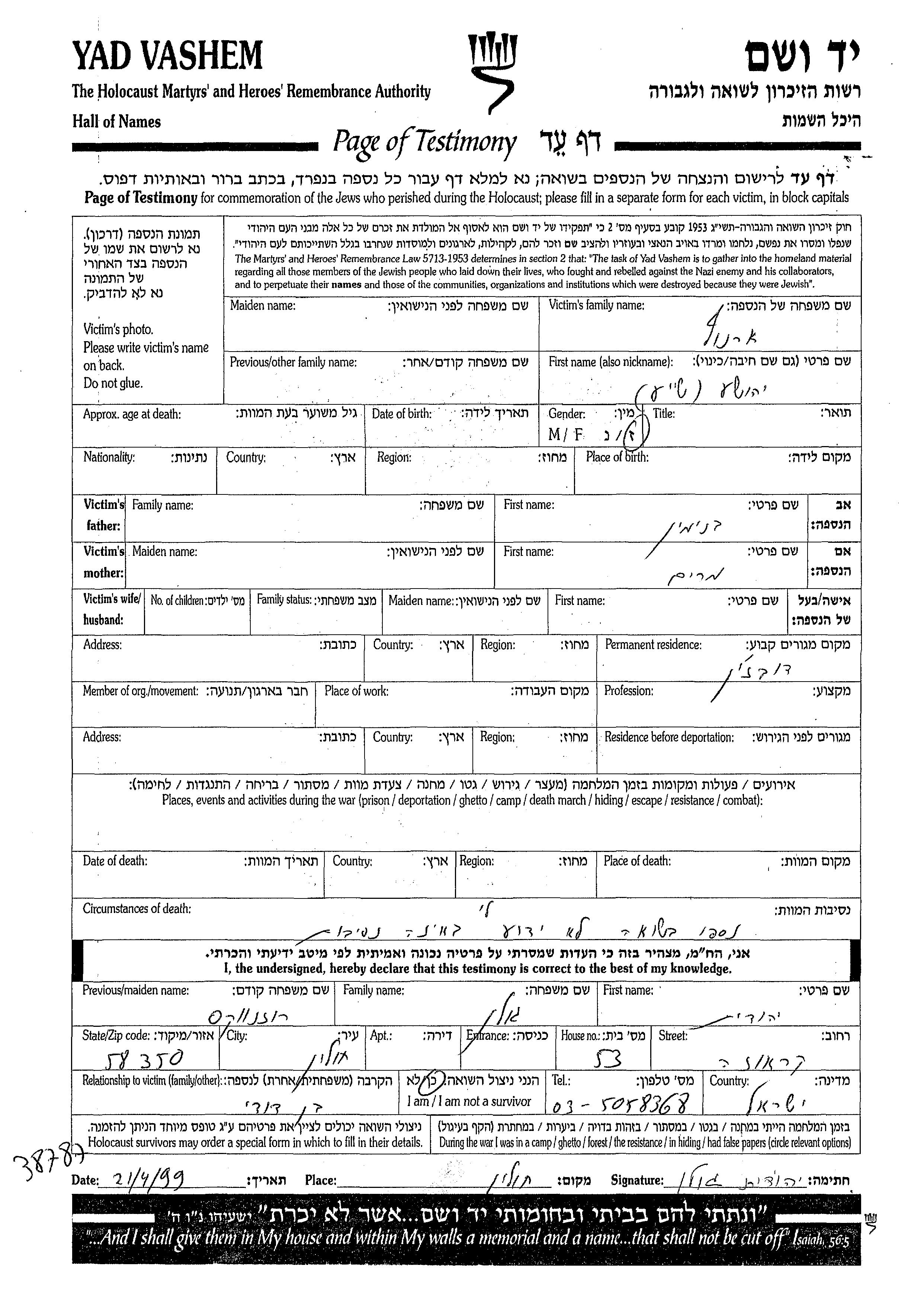 Яд Вашем - Листы свидетельских показаний Мемориального фонда