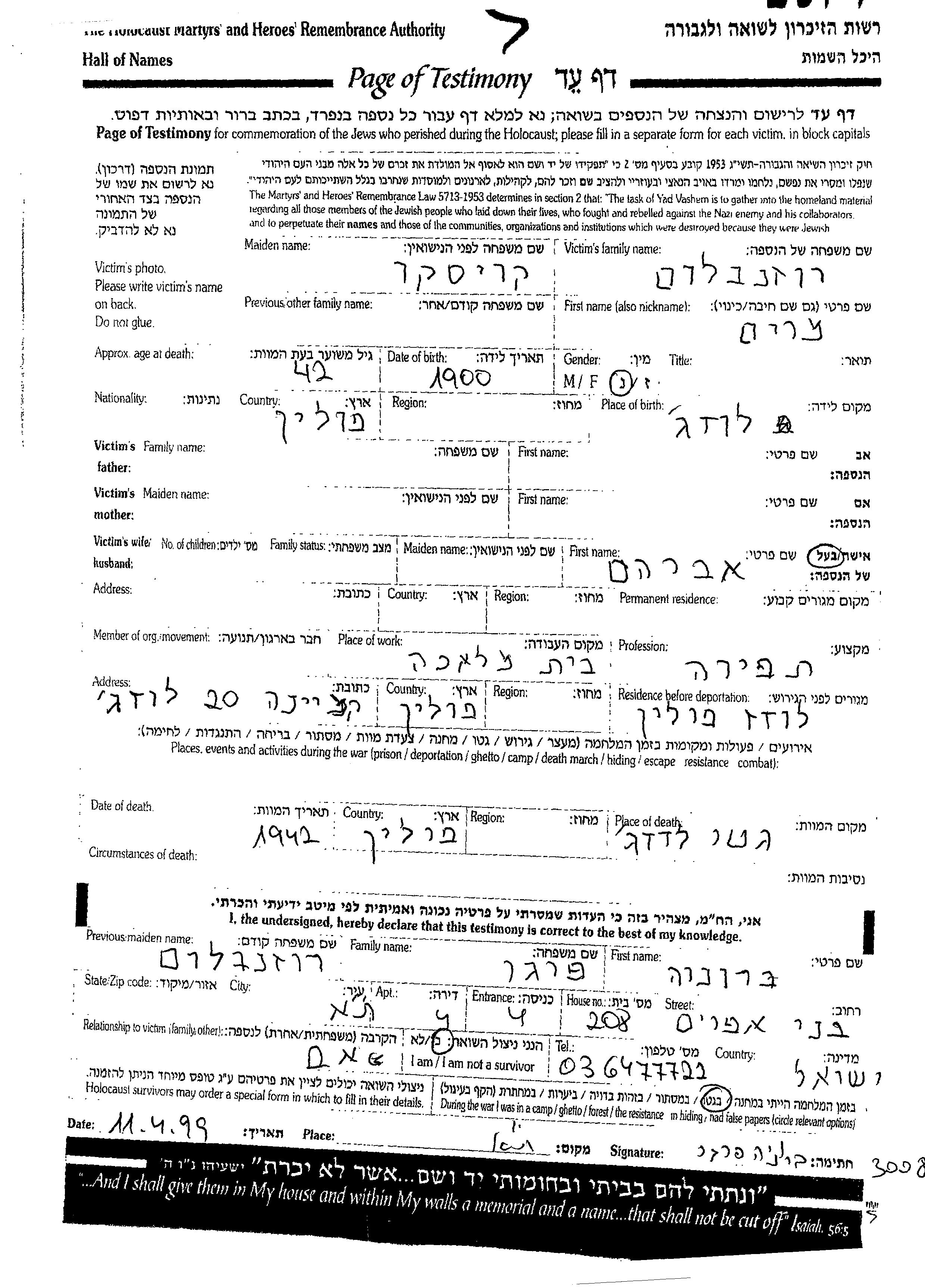 Розенблюм Мирьям 1900 Лодзь, Польша Лист свидетельских показаний