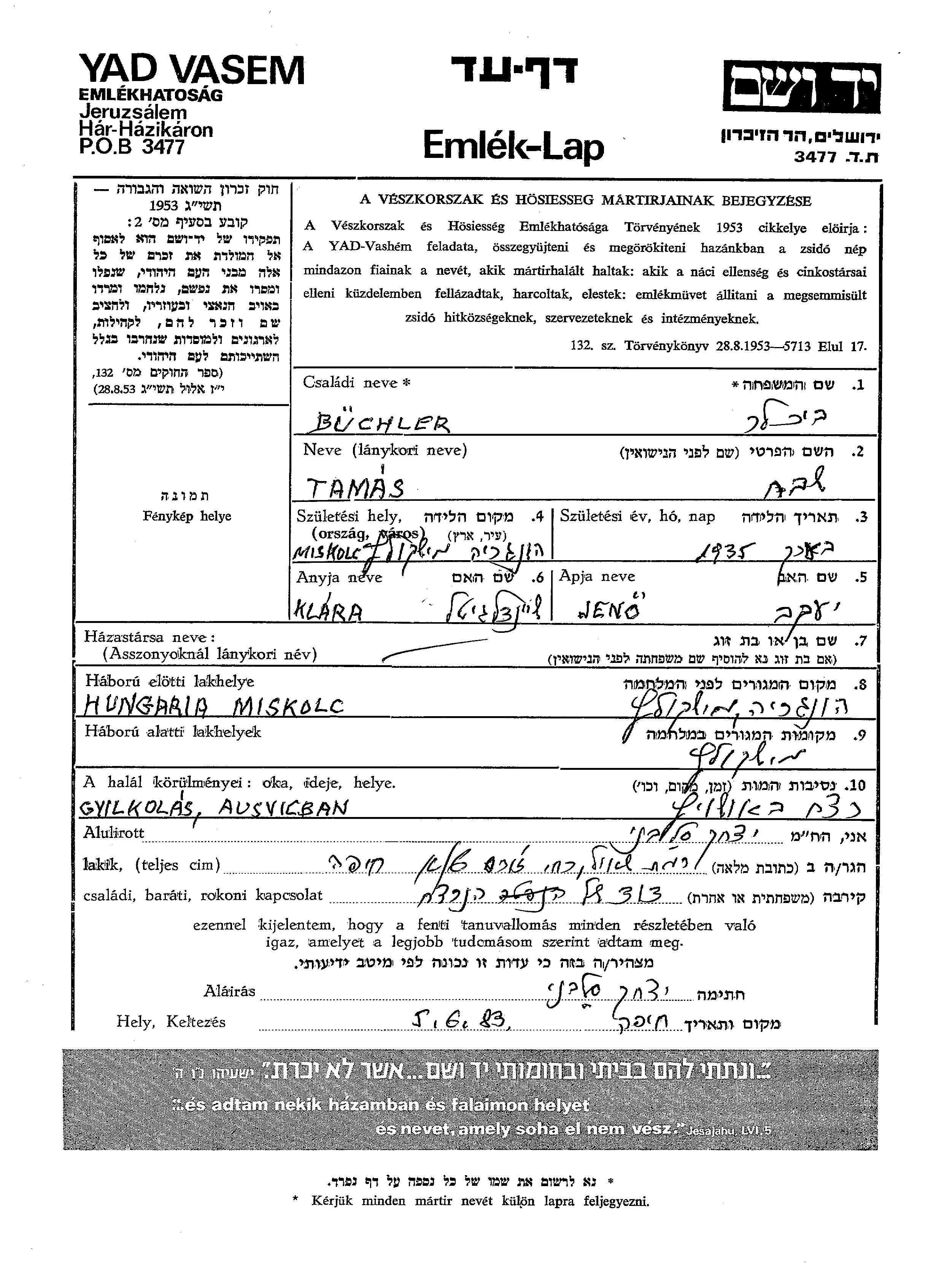 Тамас Шевах Бухлер Бихлер, место рождения: Мишкольц, Венгрия. Отец: Ено Яков, mать:Шейндель Гитель Клара. Место жительства до войны: Мишкольц, Венгрия. Место во время войны: Мишкольц, Венгрия.