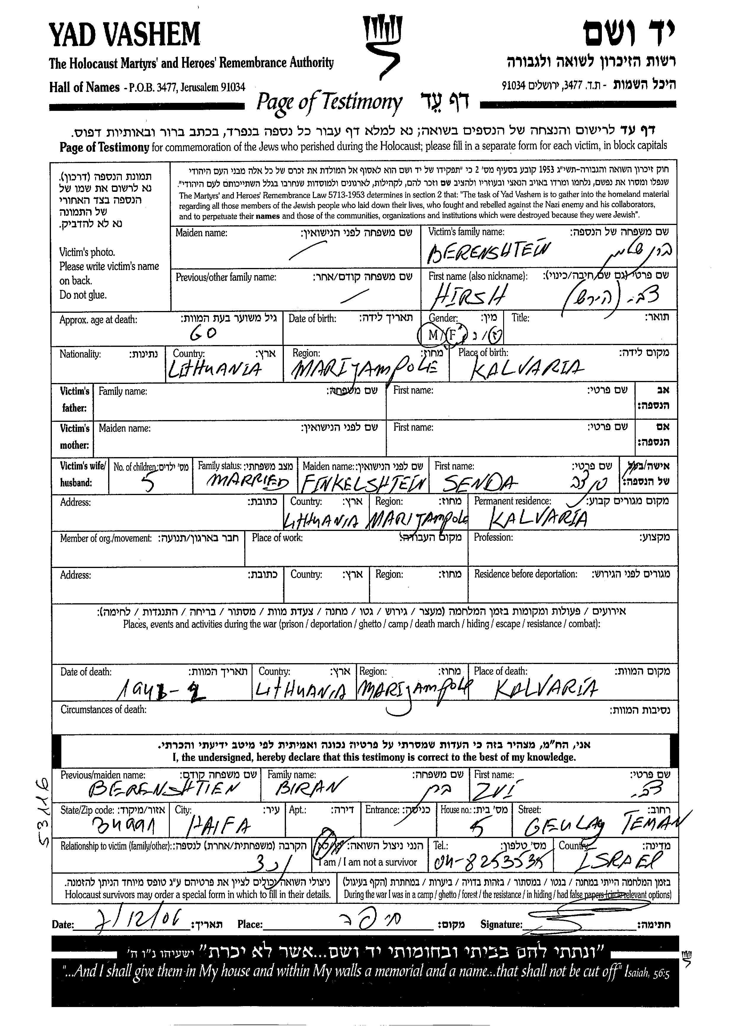 Цви Хирш Бернштейн, место рождения: Калвария, Литва. Женат / замужем. Место жительства до войны: Калвария, Литва. Место во время войны: Калвария, Литва.