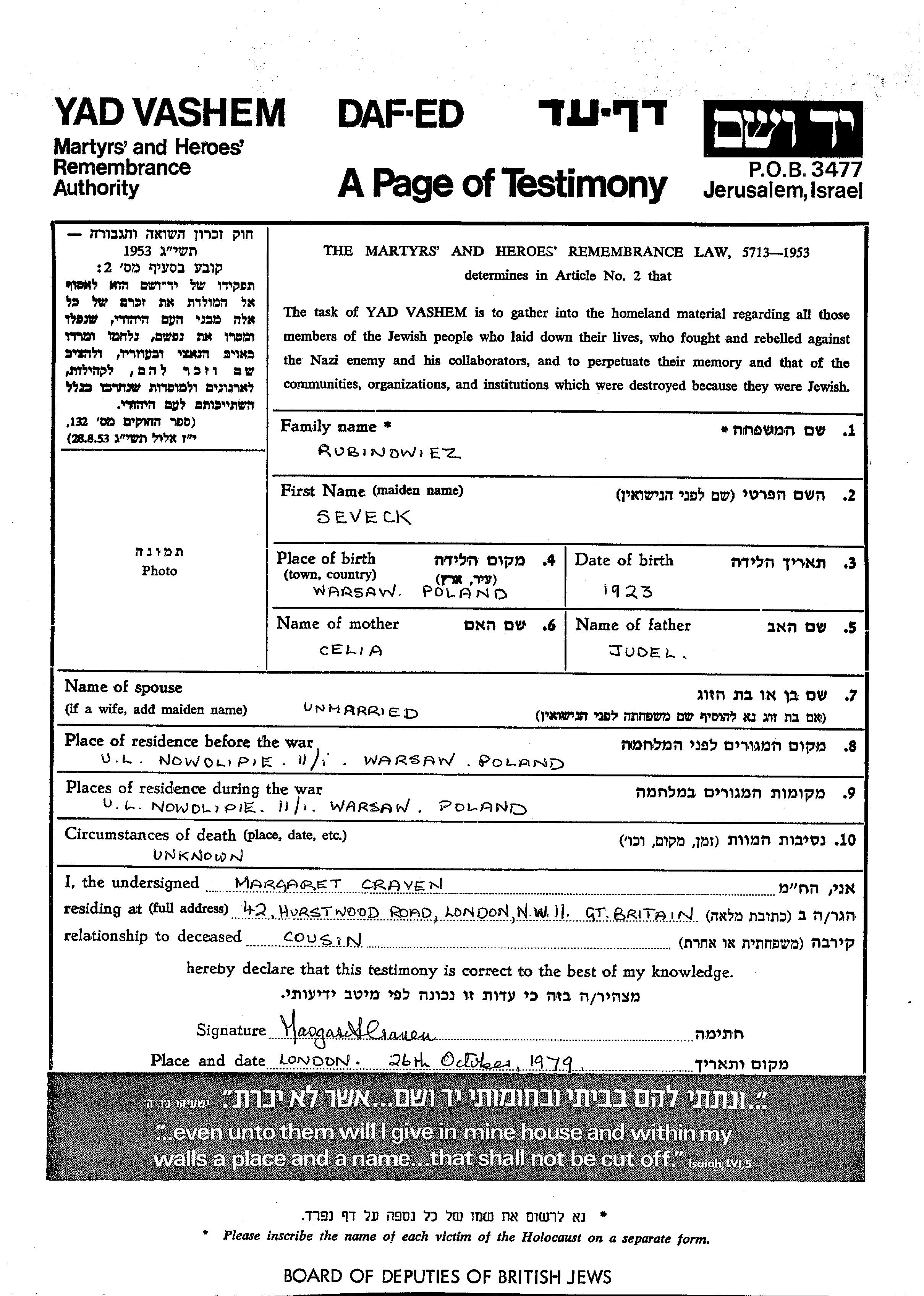 Рубинович Севек 1923 Варшава, Польша Лист свидетельских показаний