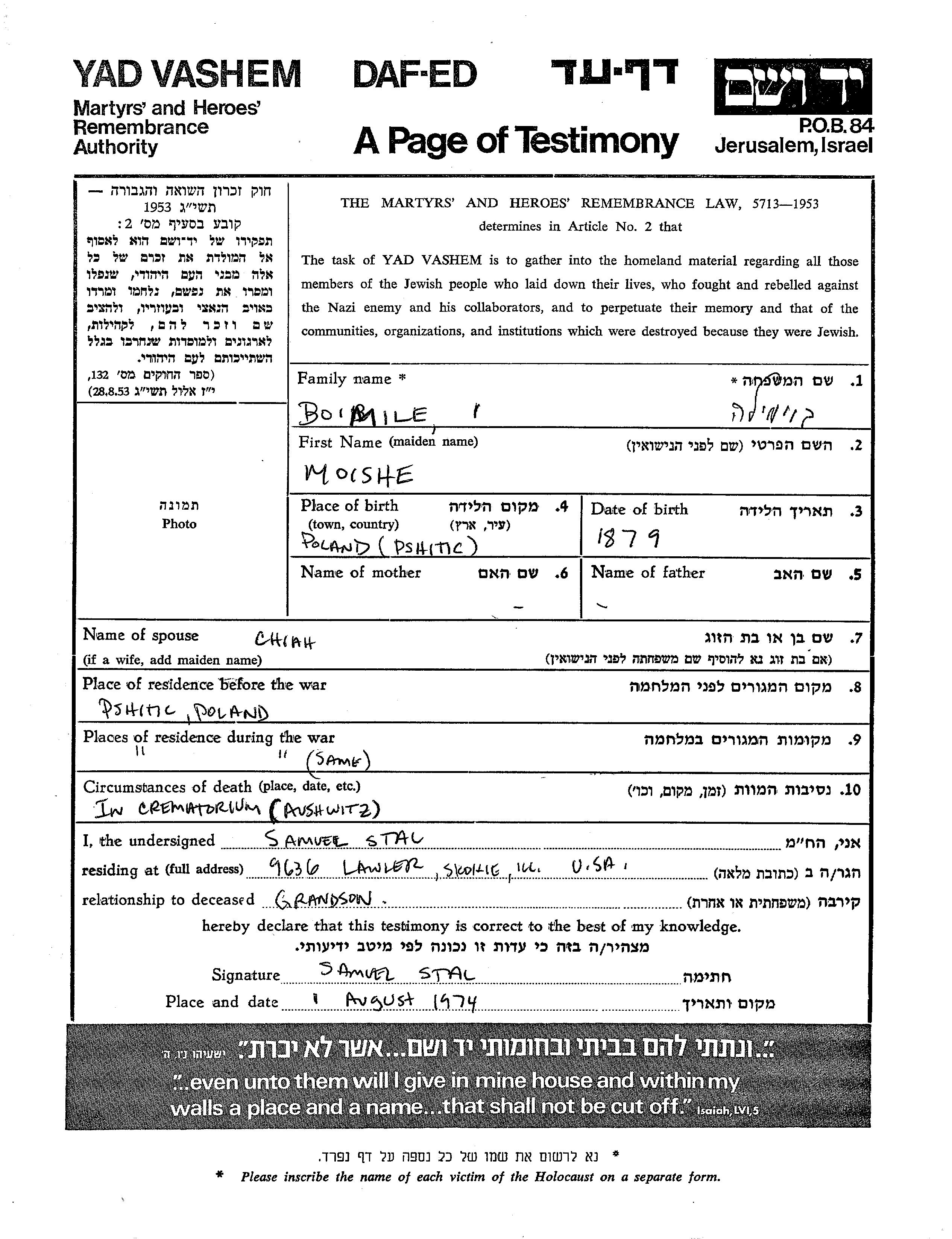 Мойше Боймиле, место рождения: Пшитык, Польша. Женат / замужем. Место жительства до войны: Пшитык, Польша. Место во время войны: Пшитык, Польша.