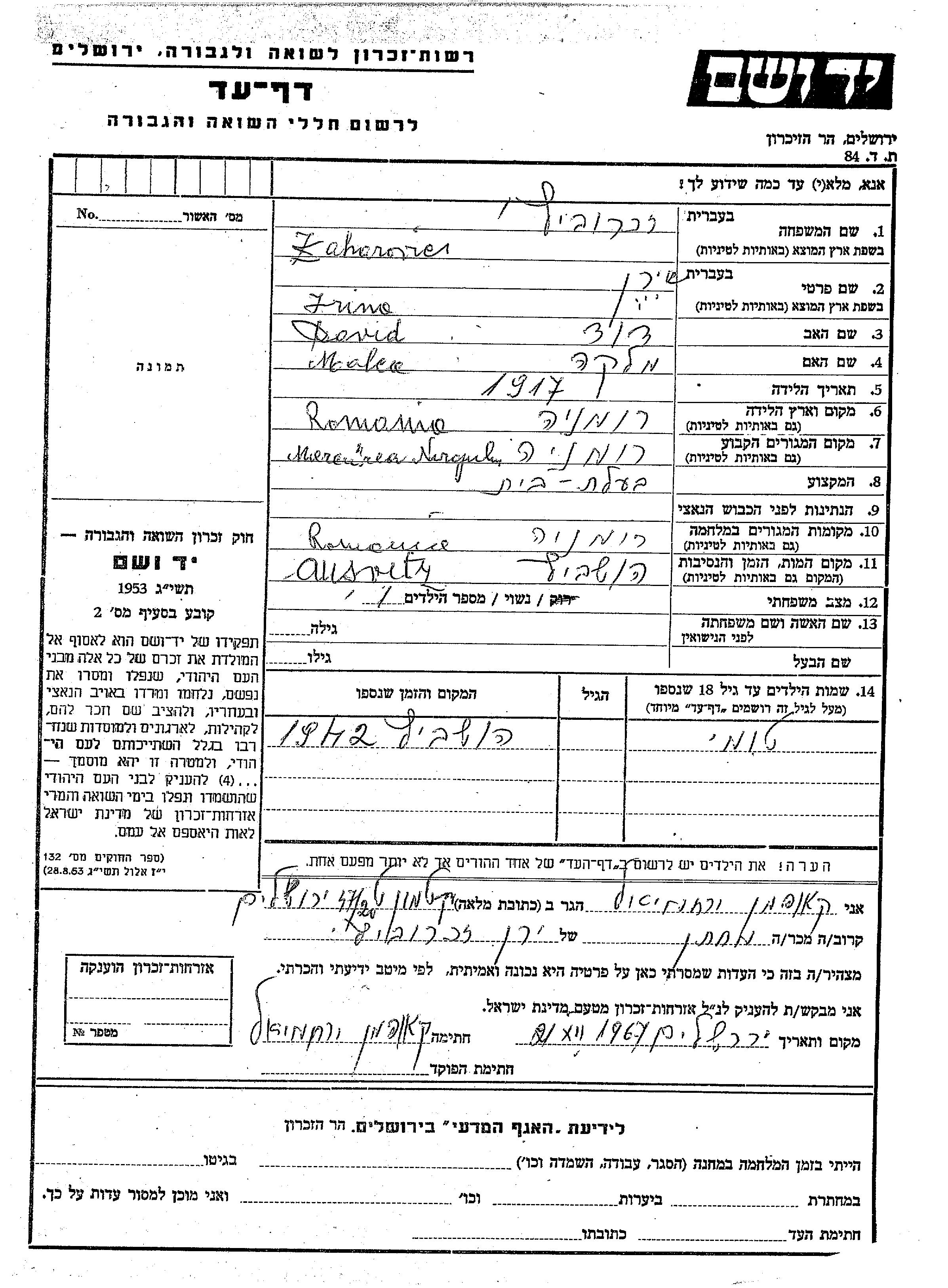 Ирина Захарович, место рождения: Румыния. Отец: Давид, mать:Малка. Домохозяйка. Женат / замужем. Место жительства до войны: Меркуря-Нираж, Румыния. Место во время войны: Румыния.